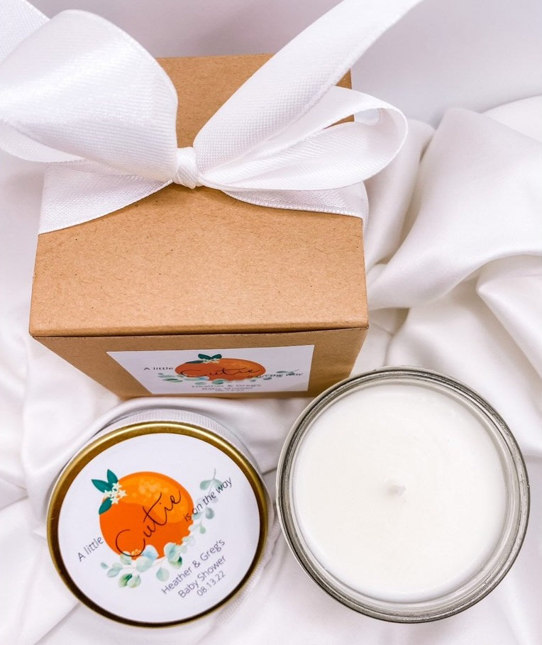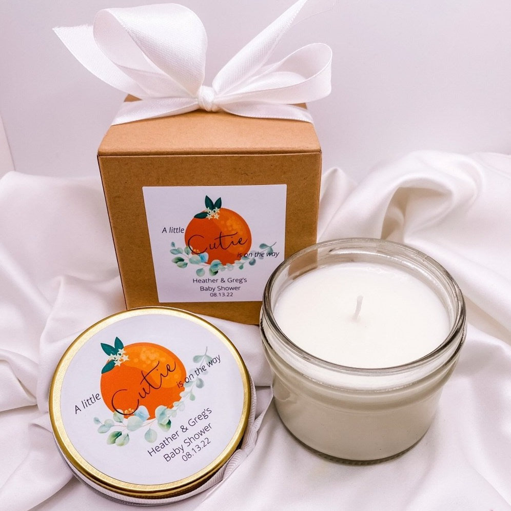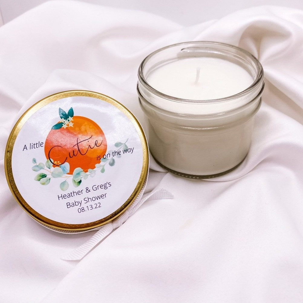 1-4 ounce jelly jar soy candle in the fragrance of your choice from the drop down menu. A personalized label to match your event. All of our labels are completely customizable. Providing as much details as possible, will help us in the designing process. Letting us know a theme or color scheme is a great way to speed the process. If you have a picture of something you would like, send them too!