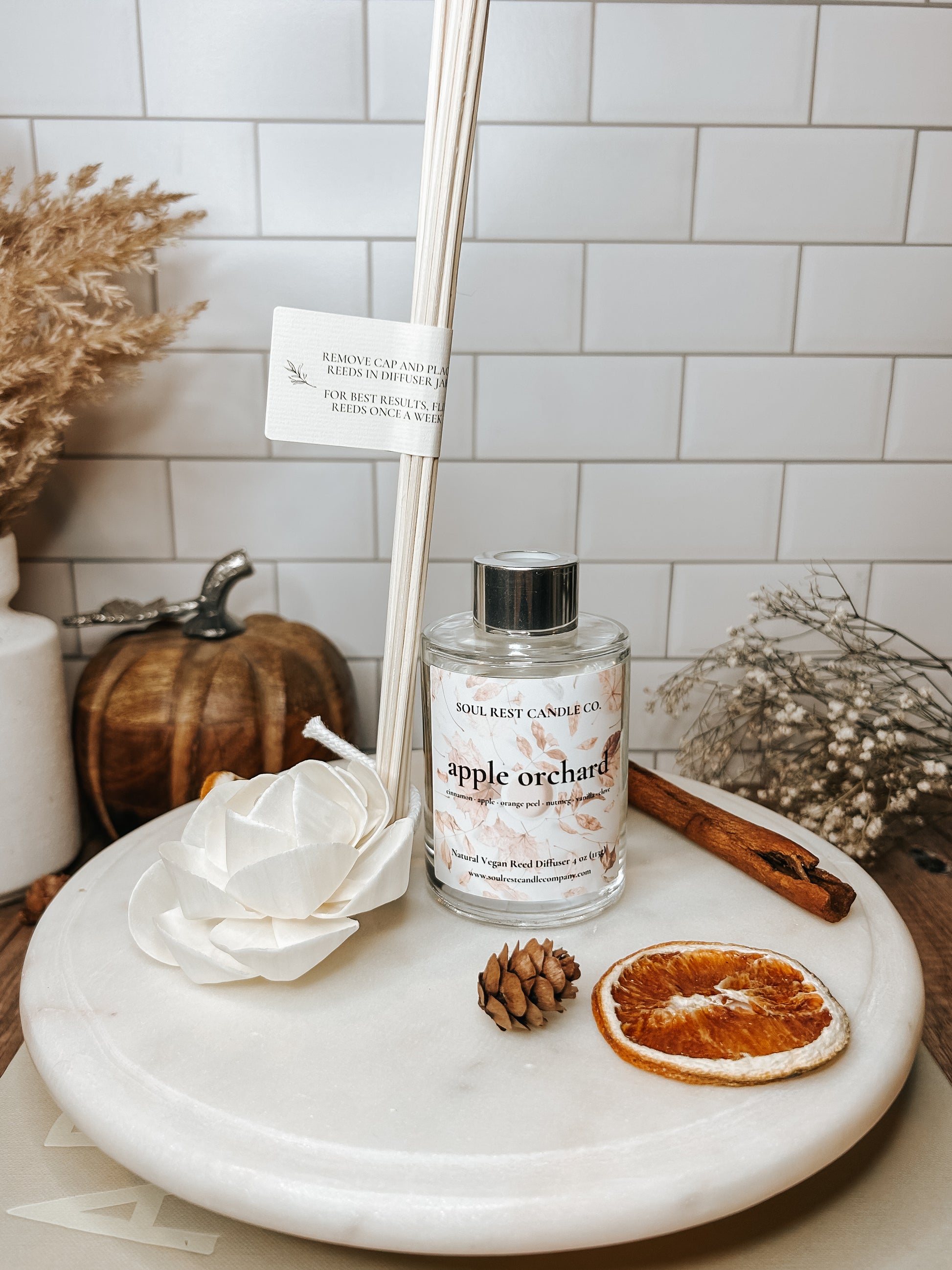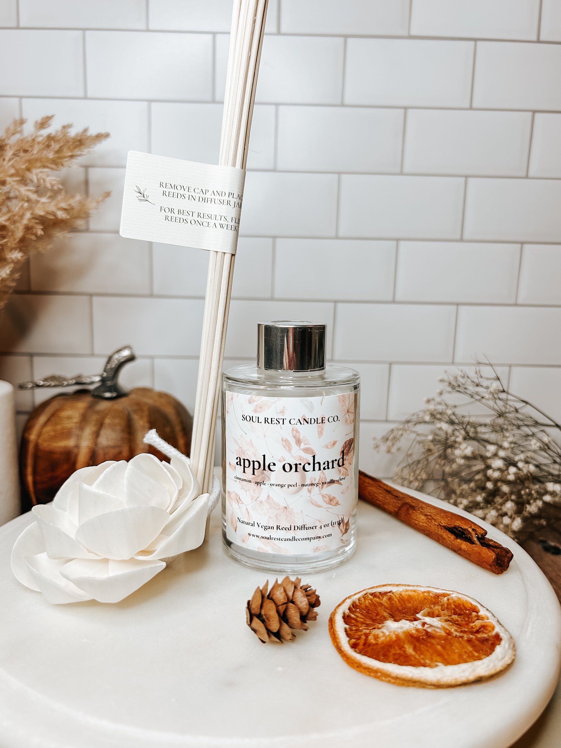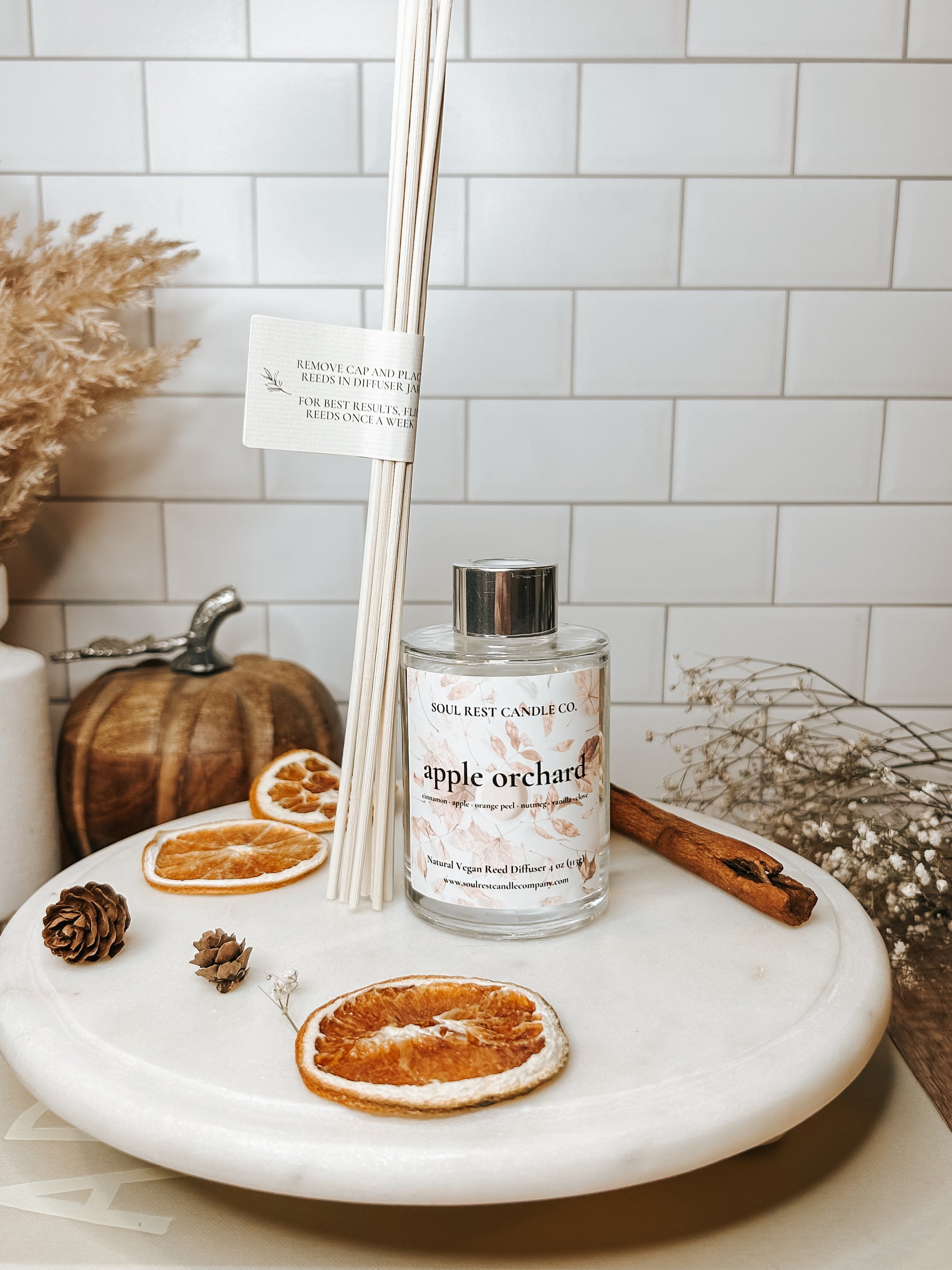 Embrace the cozy spirit of fall with our aromatic reed diffuser. A delightful blend of cinnamon, apple, and orange peel greets the senses with a vibrant burst of warmth. The rich, spiced notes of nutmeg and clove add a touch of nostalgia, while the smooth, creamy hint of vanilla softens the edges, creating an inviting atmosphere. Enjoy a continuous, subtle fragrance that evokes tranquility and comfort, perfect for any room.