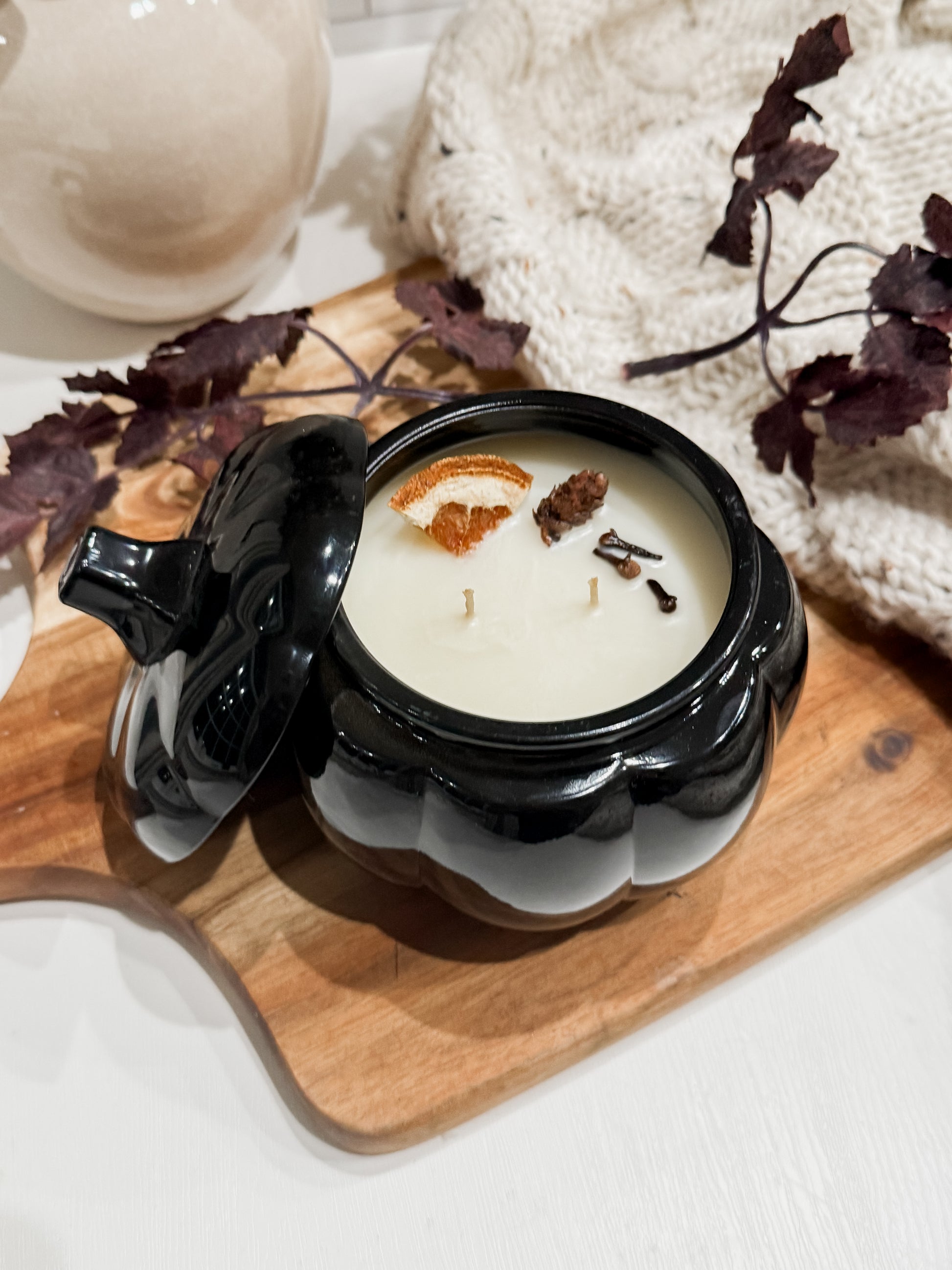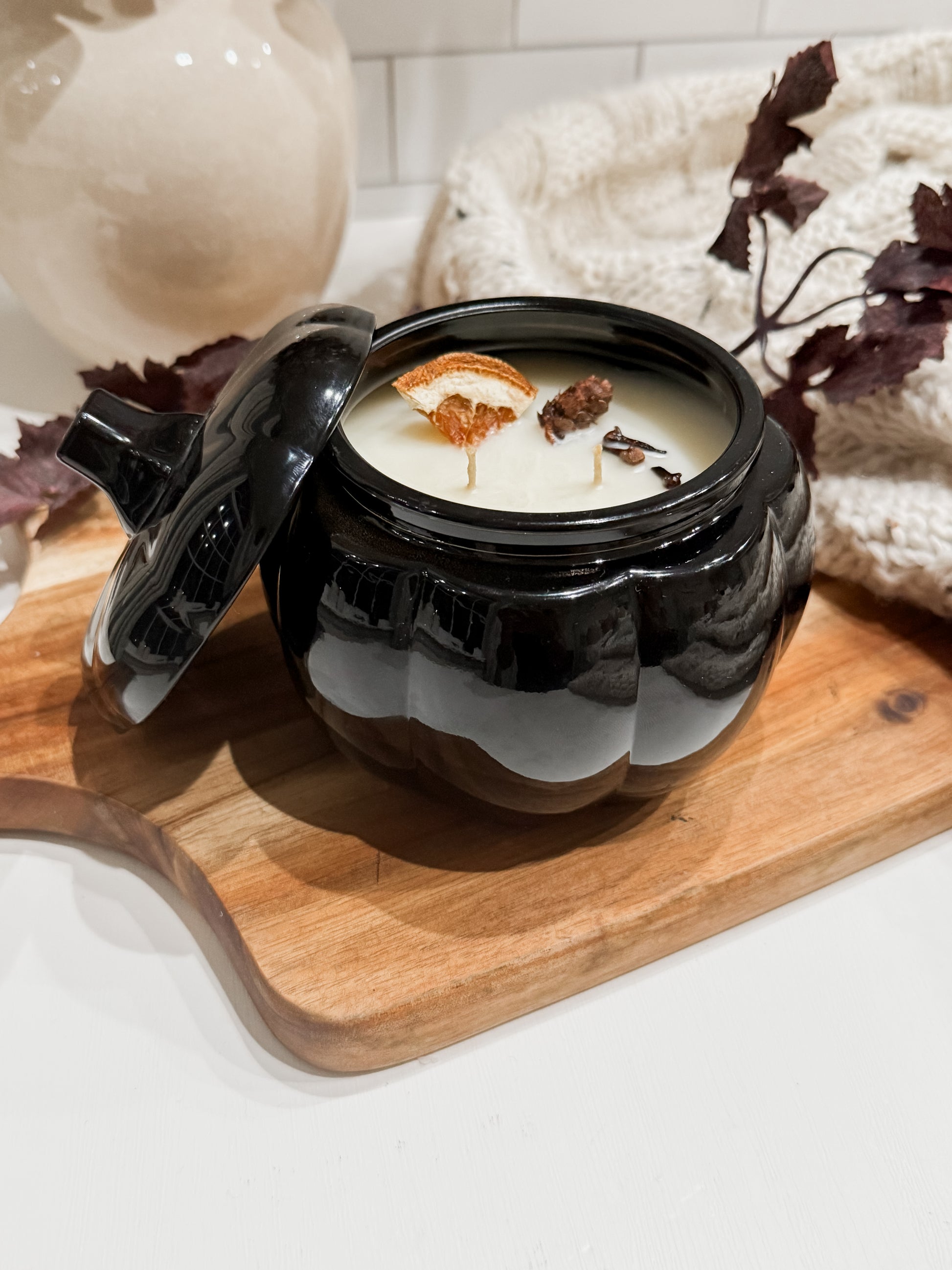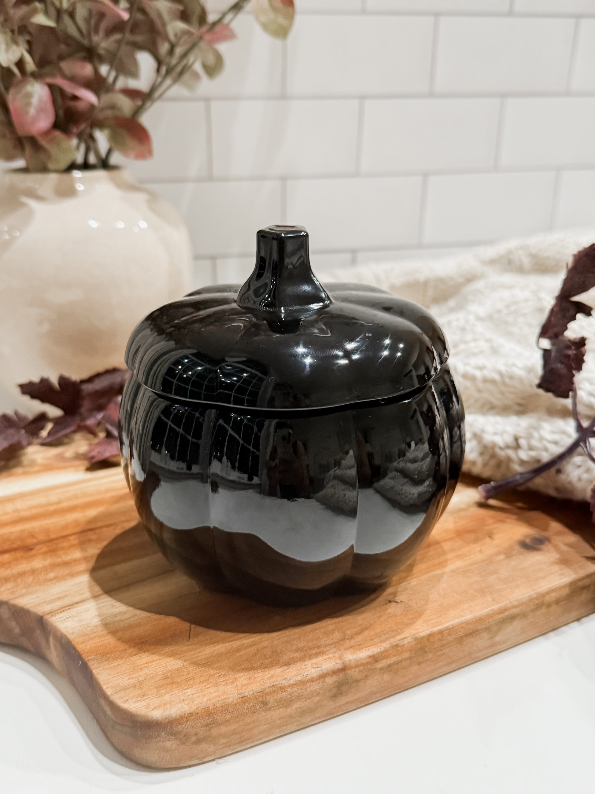 Add festive fun to your fall home decor with our Limited Edition gourd-looking Pumpkin Jar candles. This Midnight Black, double-wick, pumpkin candle comes with a lid-complete with stem. An adorable addition to your autumn and fall home decor.