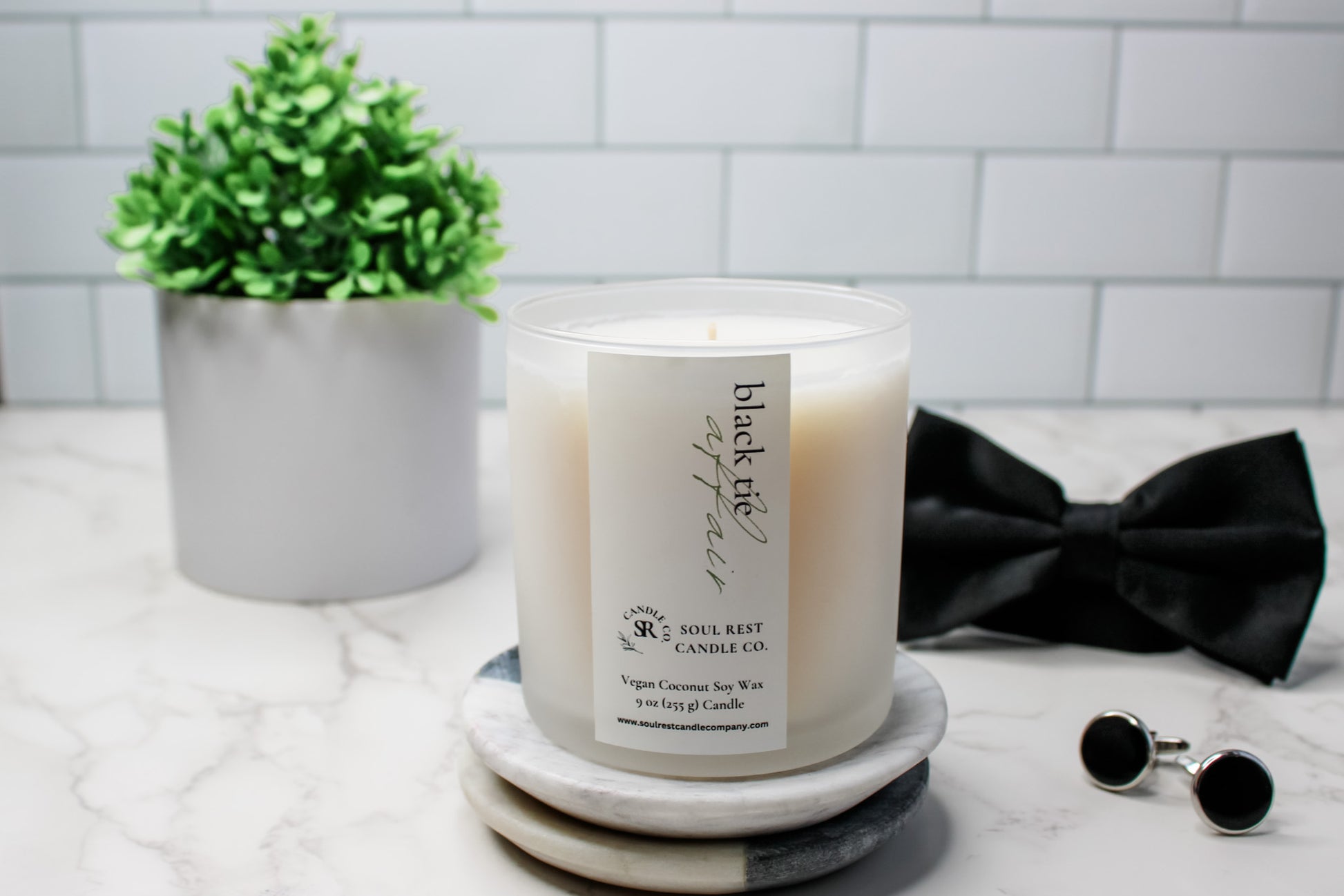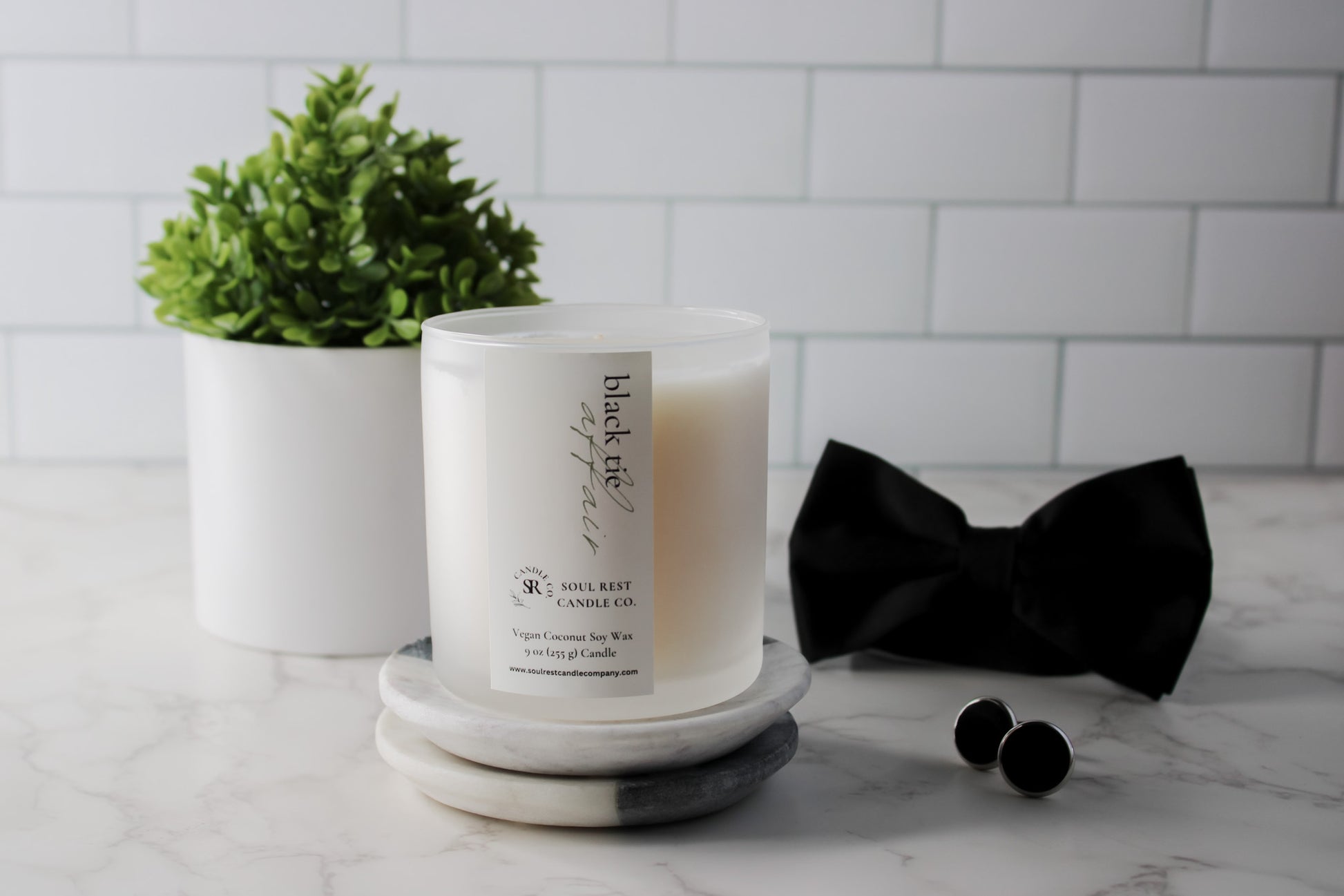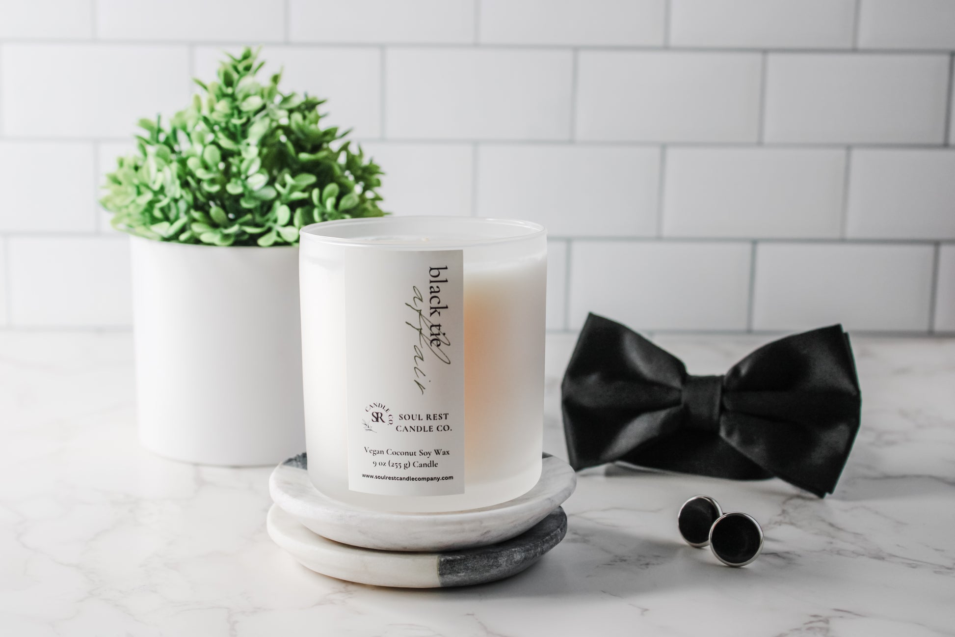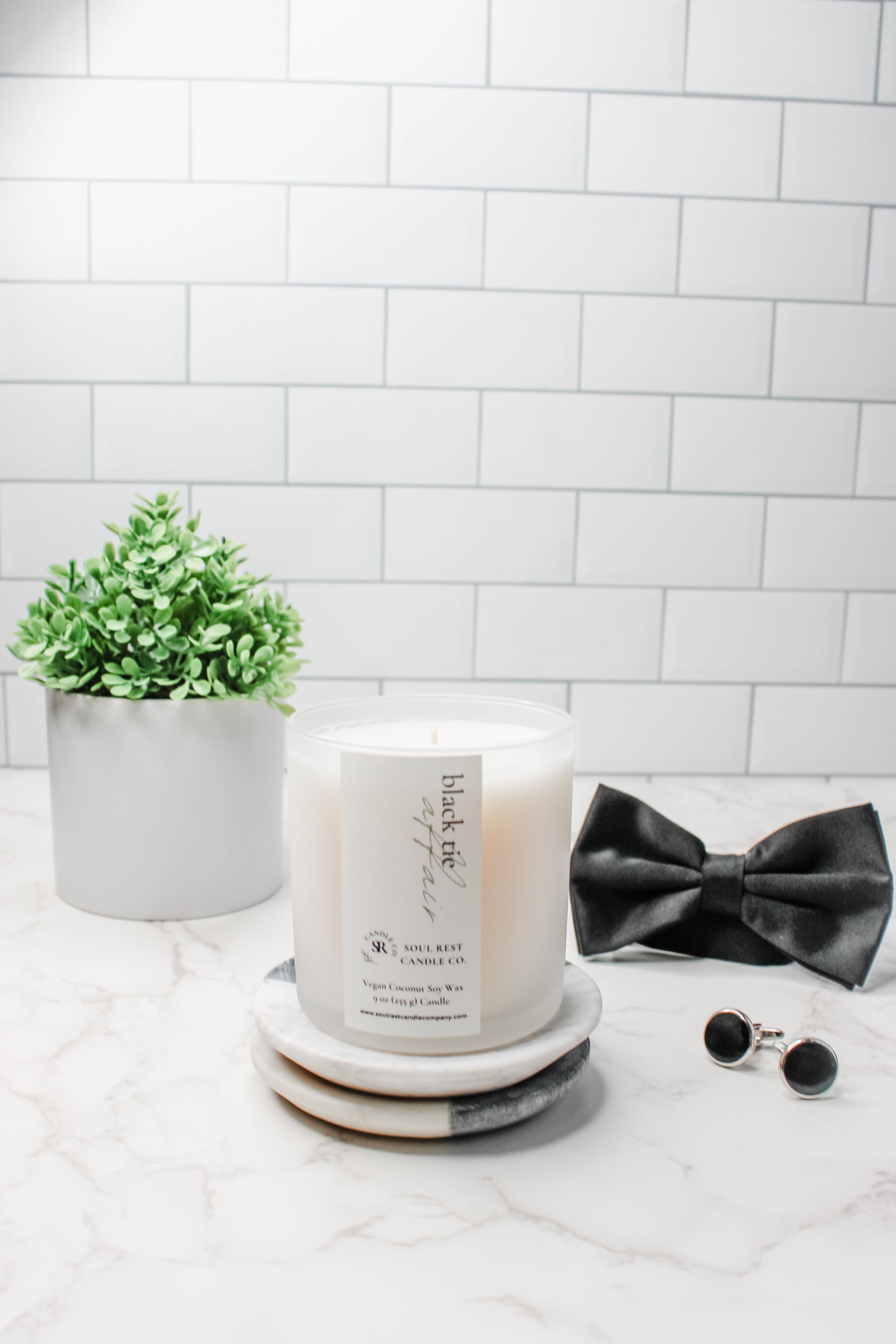 Black Tie Affair-this candle smells just like fresh cologne with complex notes of lavender, vanilla, woodsy and musk, creating the ideal sexy, masculine scented candle.