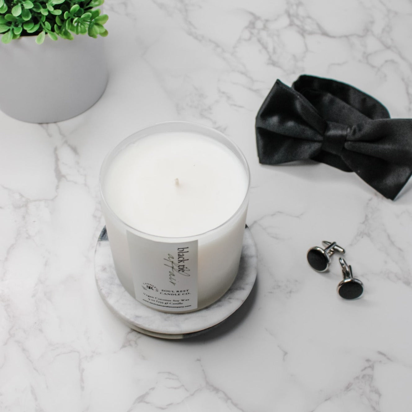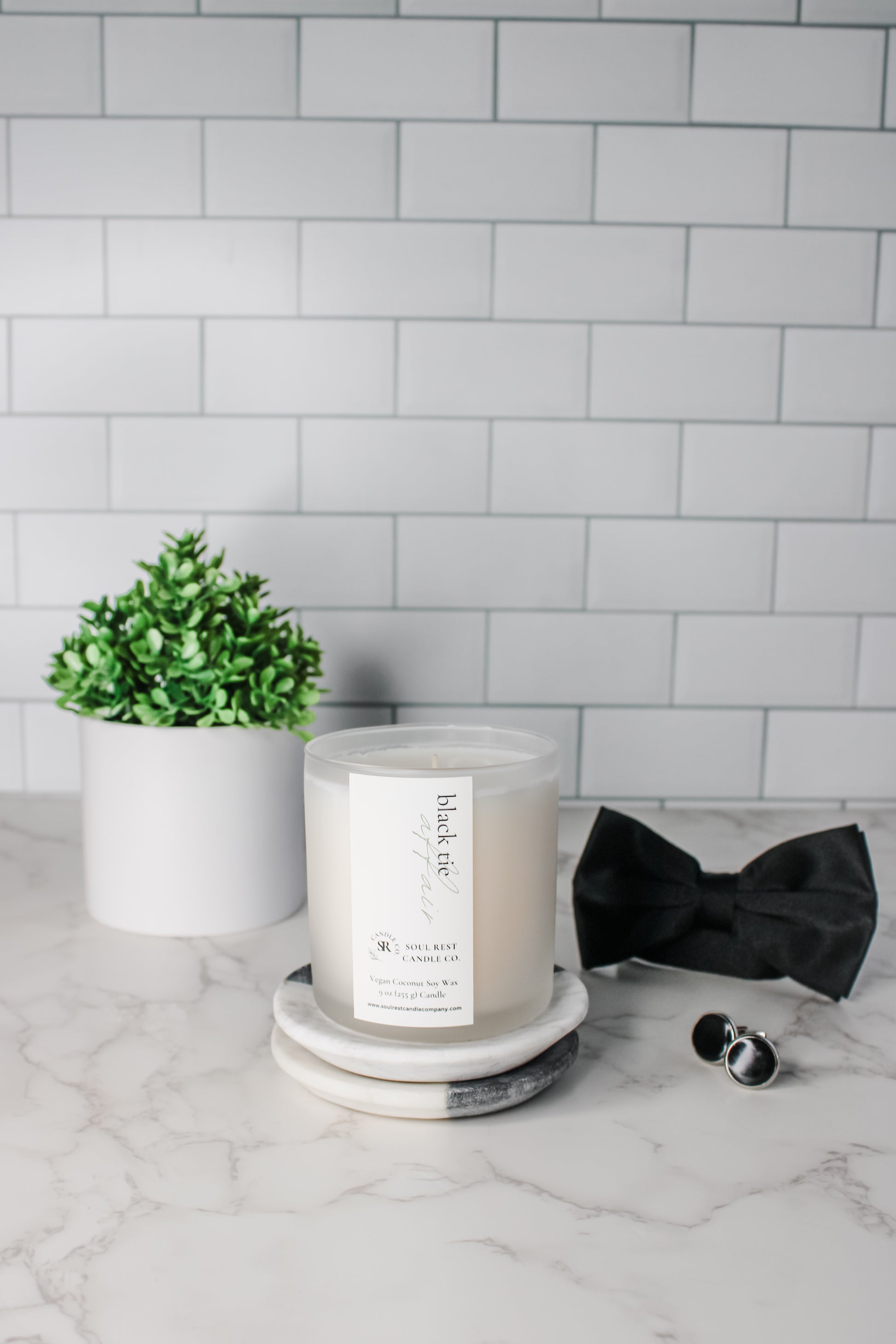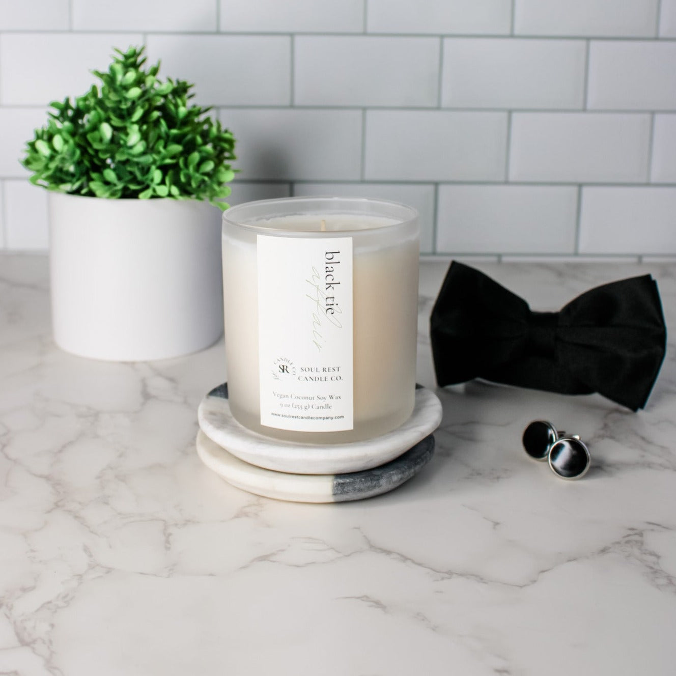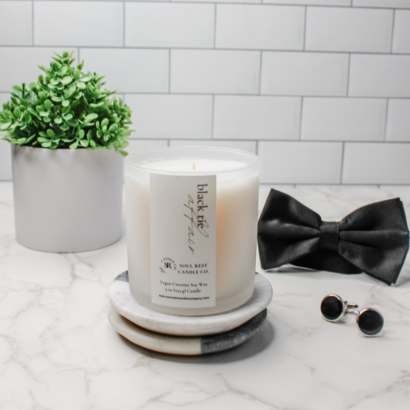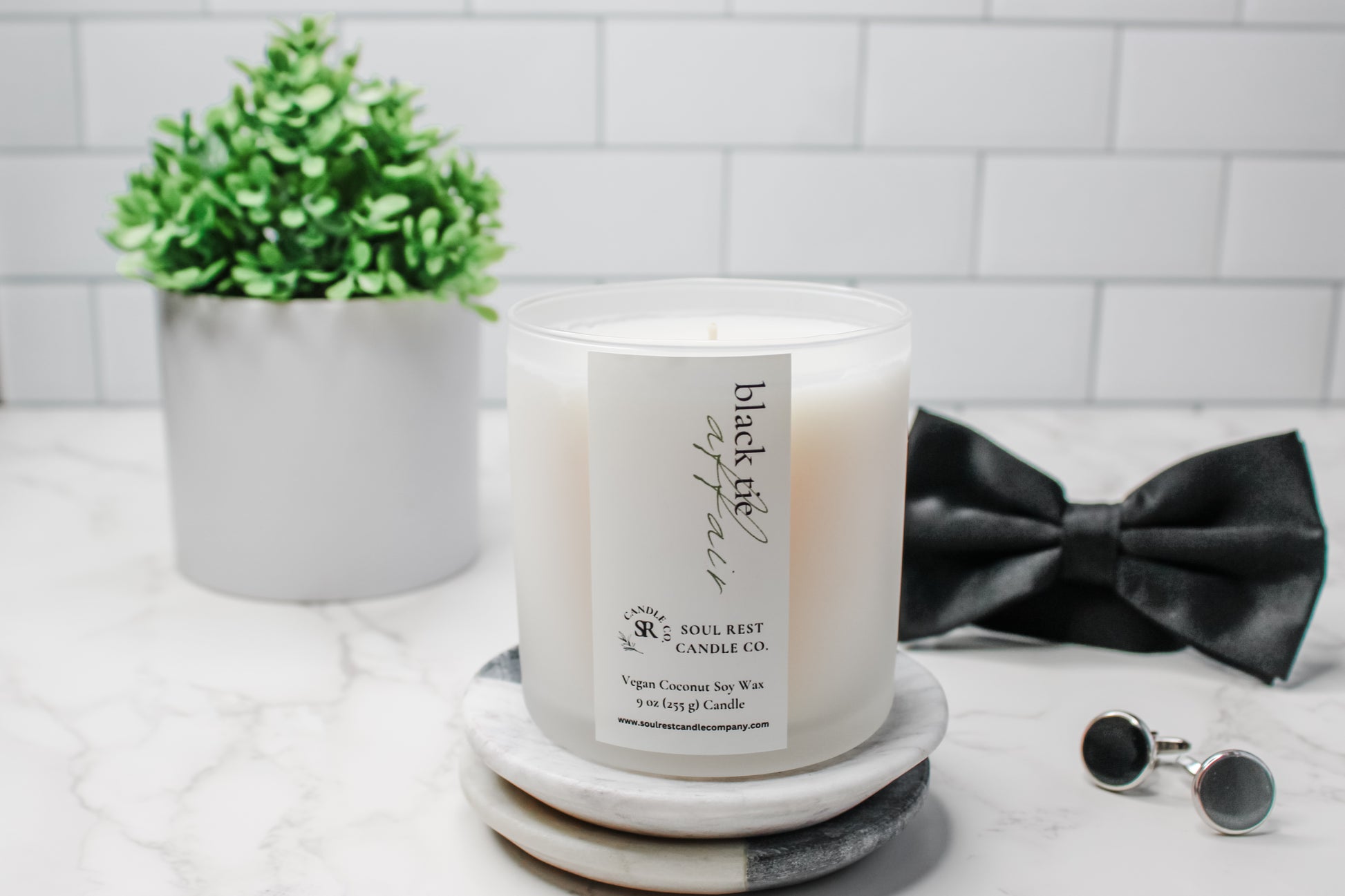 Black Tie Affair-this candle smells just like fresh cologne with complex notes of lavender, vanilla, woodsy and musk, creating the ideal sexy, masculine scented candle.