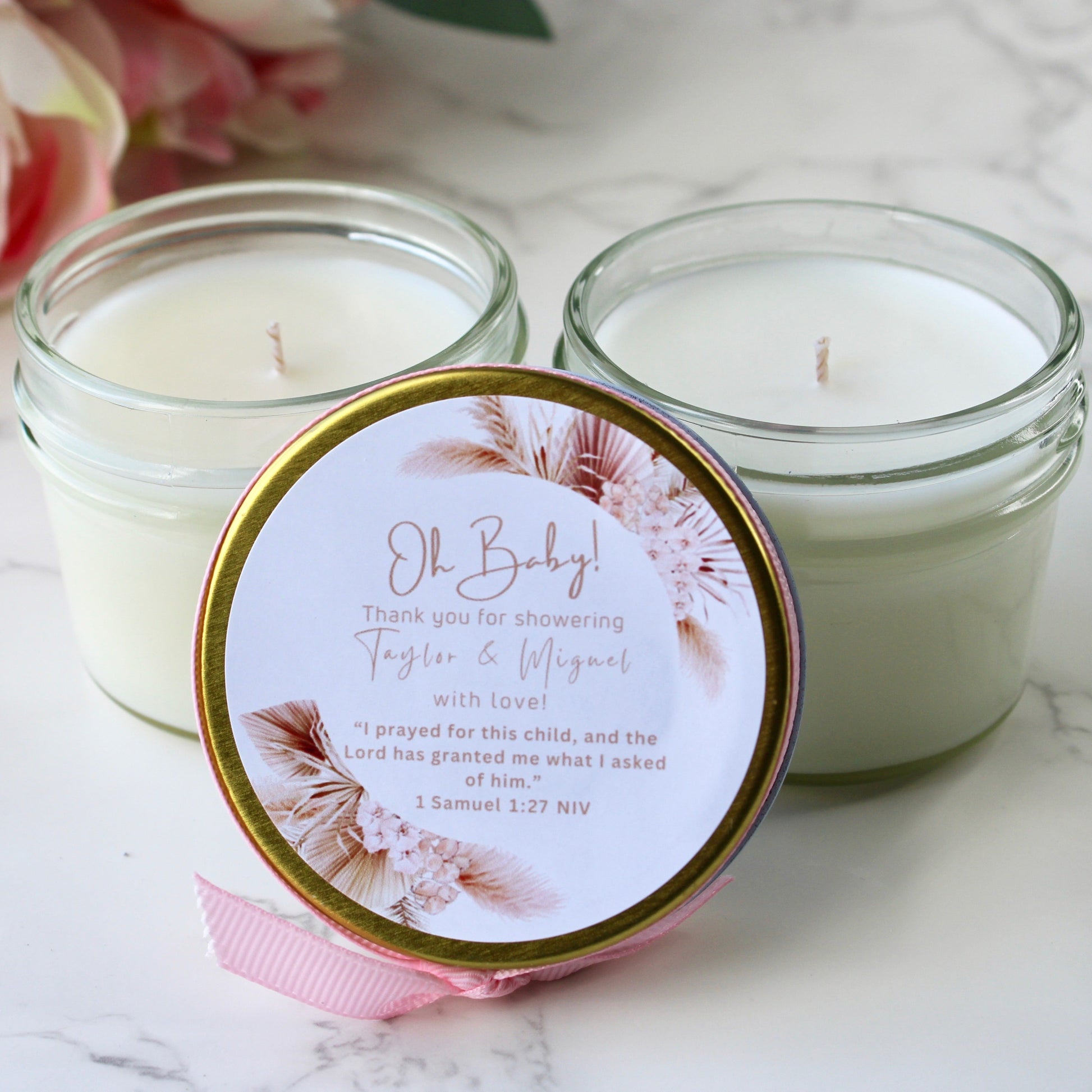 1-4 ounce jelly jar soy candle in the fragrance of your choice from the drop down menu. A personalized label to match your event. All of our labels are completely customizable. Providing as much details as possible, will help us in the designing process. Letting us know a theme or color scheme is a great way to speed the process. If you have a picture of something you would like, send them too!