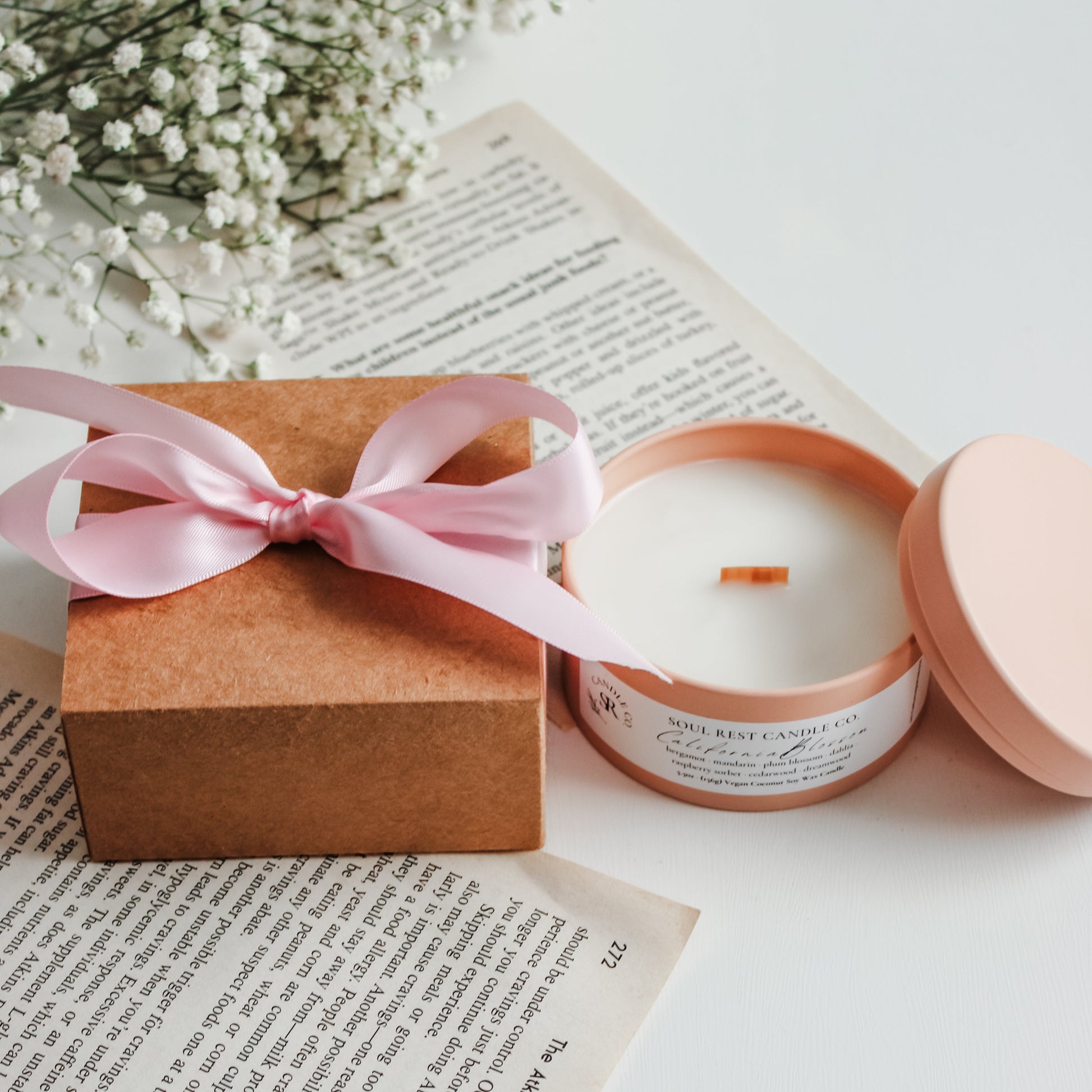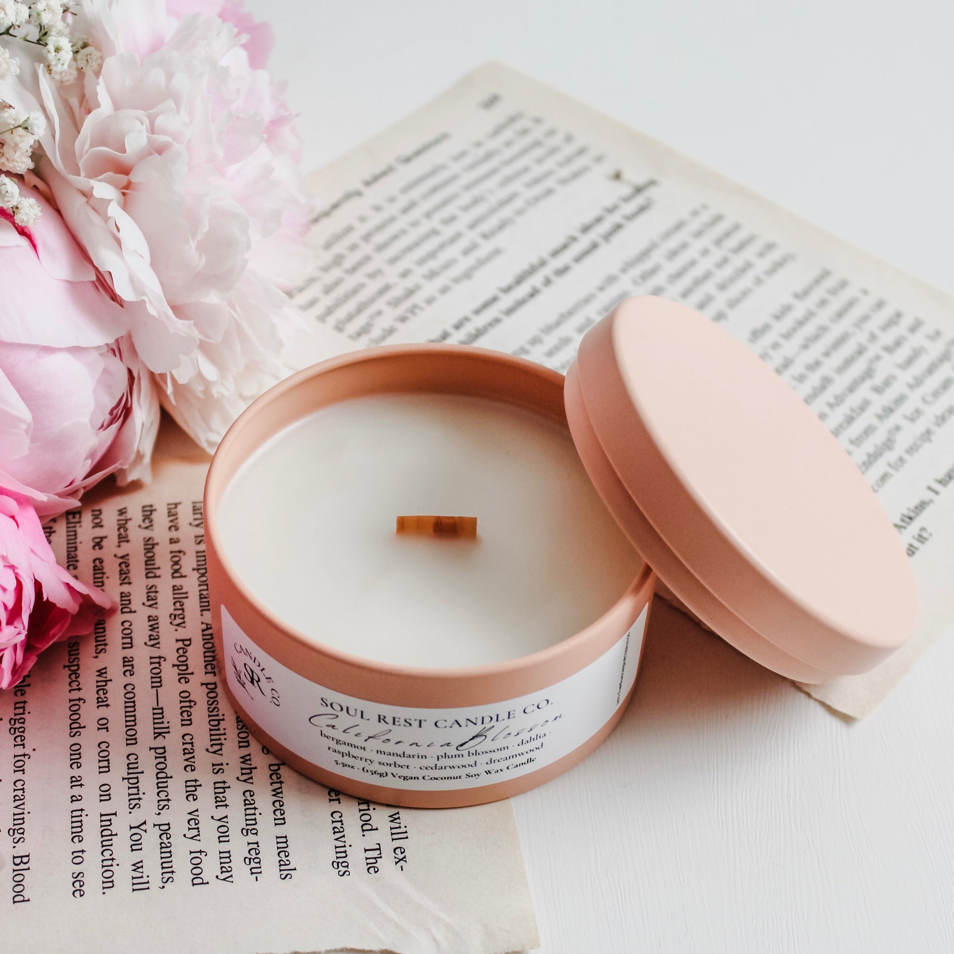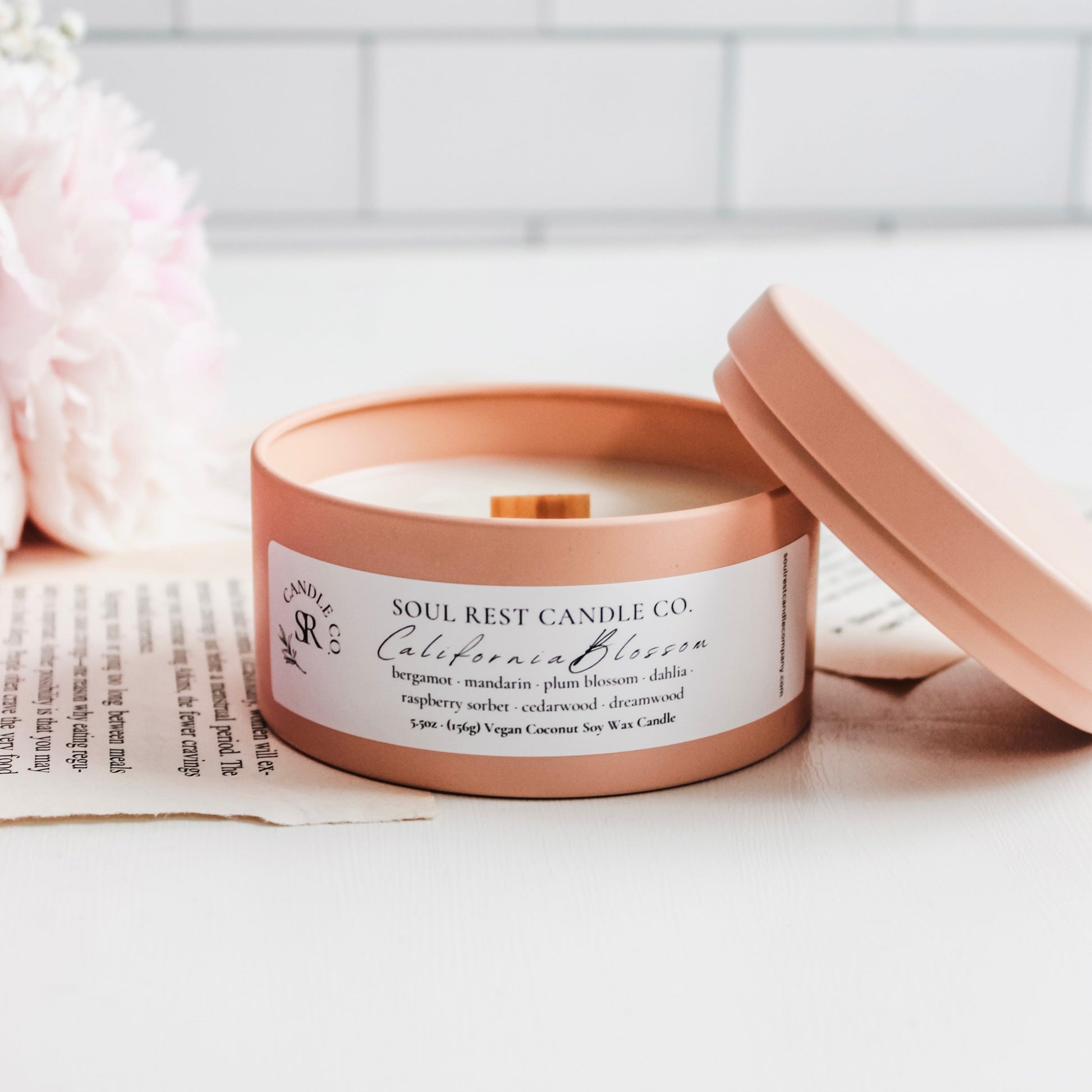 Made of vegan, Coconut Soy Wax, and hand-poured in these gorgeous reusable, metal tins. The addition of eco-friendly pearlized mica makes for a stunning shimmer as it burns. The crackling wooden wick provides just the right amount of crackling for the perfect cozy ambiance.