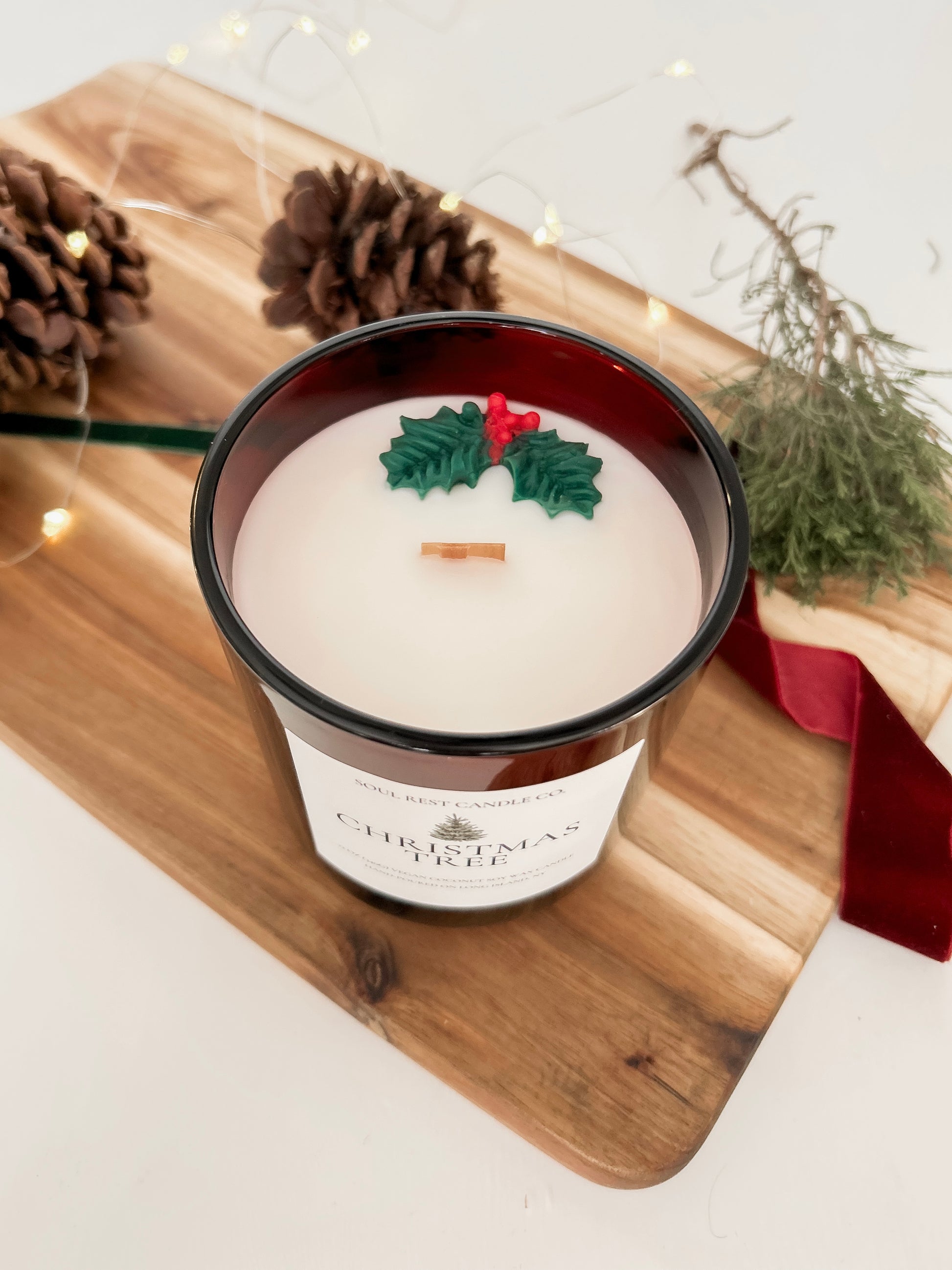 *Hand-poured in these gorgeous, wine jars, that can be repurposed as a drinking glass or to store makeup brushes. This candle comes with a classic wood wick that resembles the soothing sound of crackling wood as it burns. Adorned with a beautiful holly and infused with pearlized mica makes for a stunning shimmer as it burns.