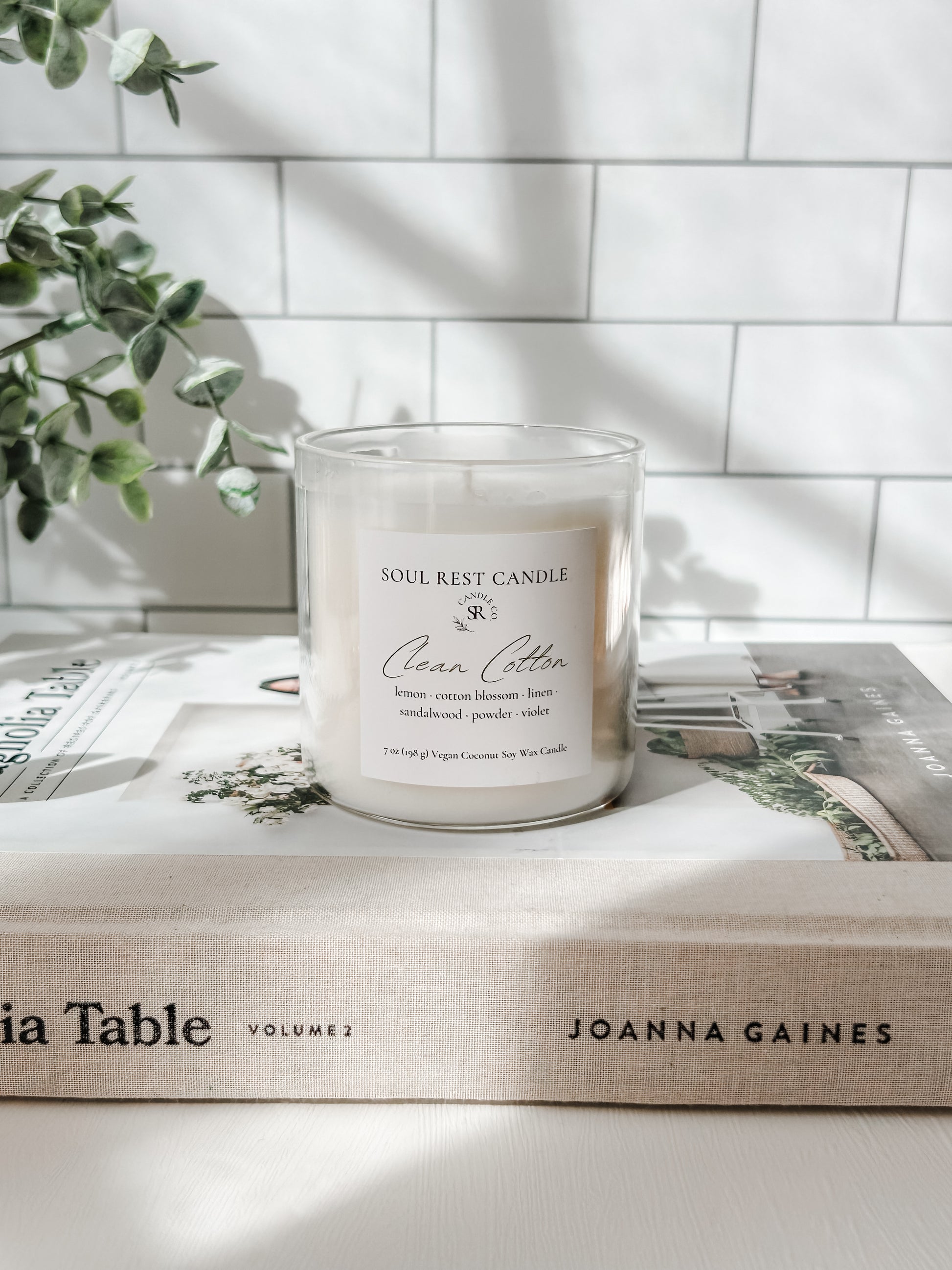 Clean Cotton- Capture the nostalgic aroma of line-dried sheets on a sunny, breezy day. This scent begins with calming cotton blossom and a touch of lemon, giving way to a heart of crisp linen. Base notes of powder, sandalwood, and violet ground this clean, classic fragrance.