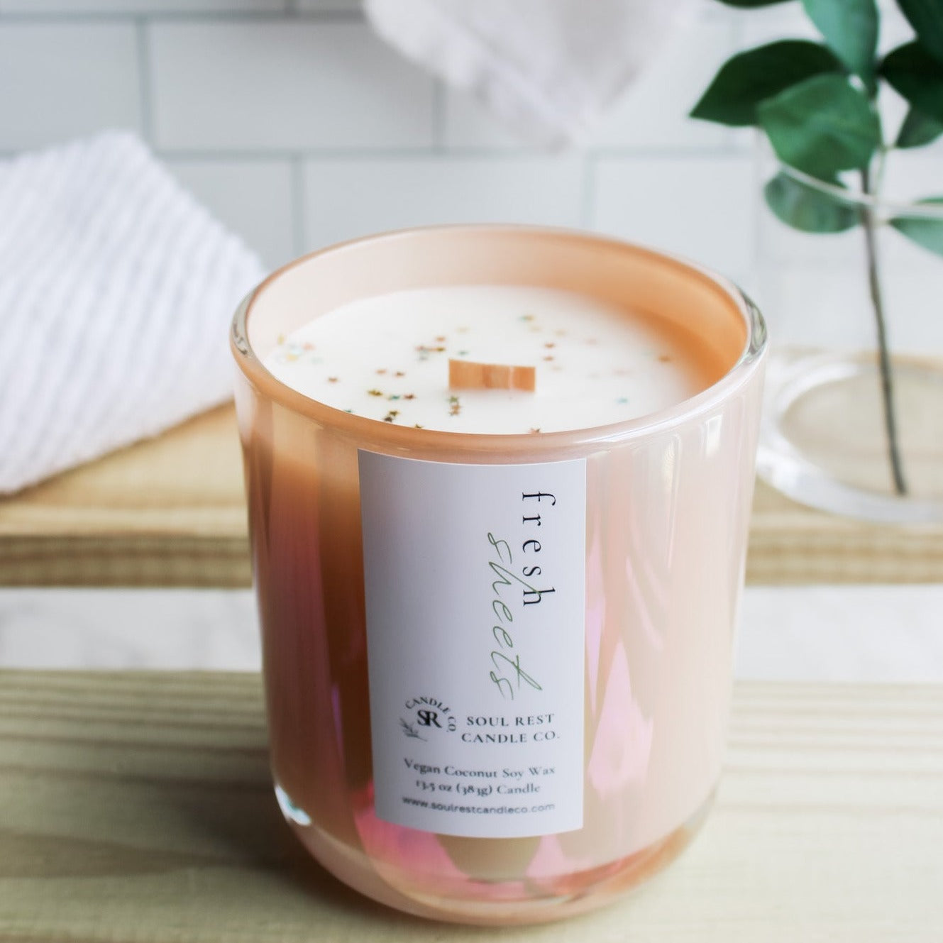 Hand-poured in these gorgeous, peach iridescent jars, that can be repurposed as a drinking glass or to store makeup brushes. Topped with glitter stars for a stunning presentation and the addition of eco-friendly pearlized mica makes for a stunning shimmer as it burns.