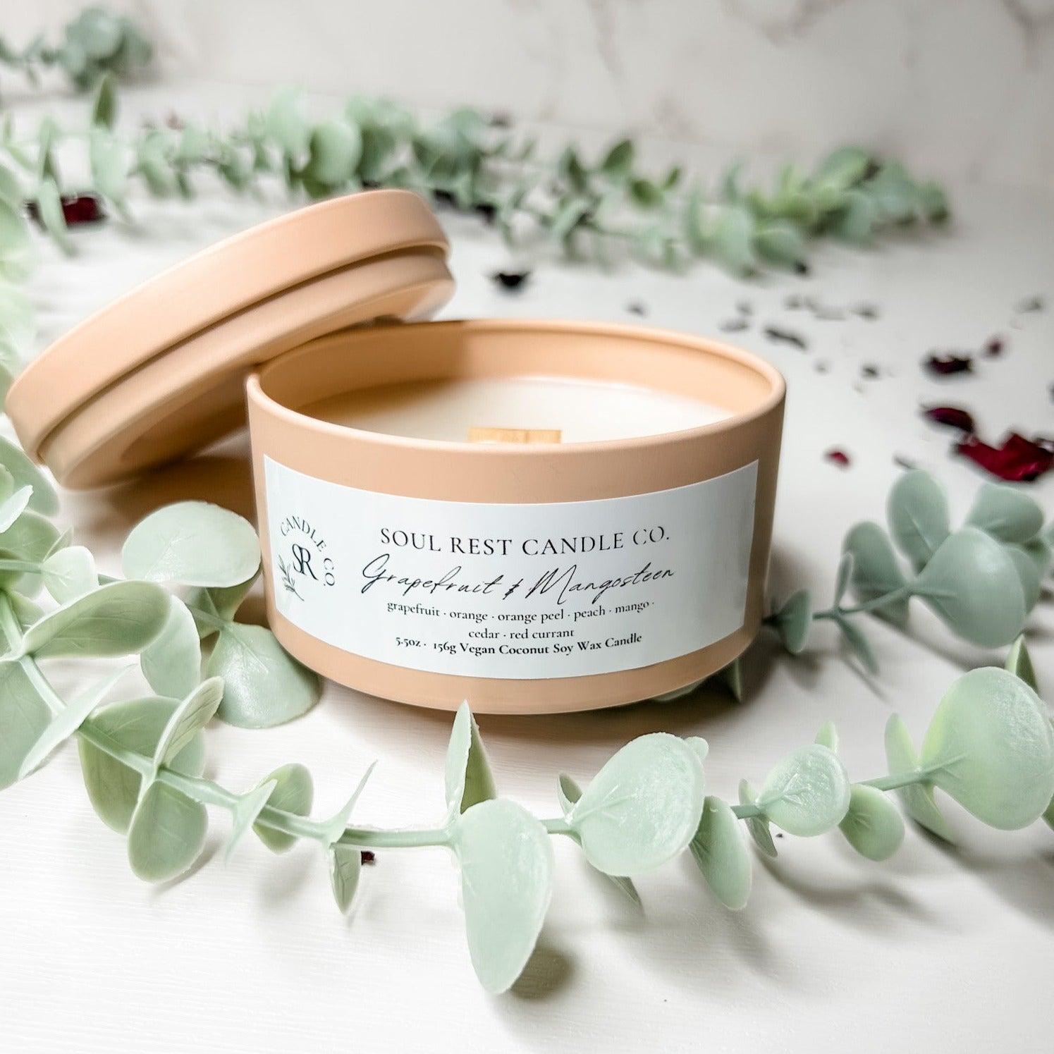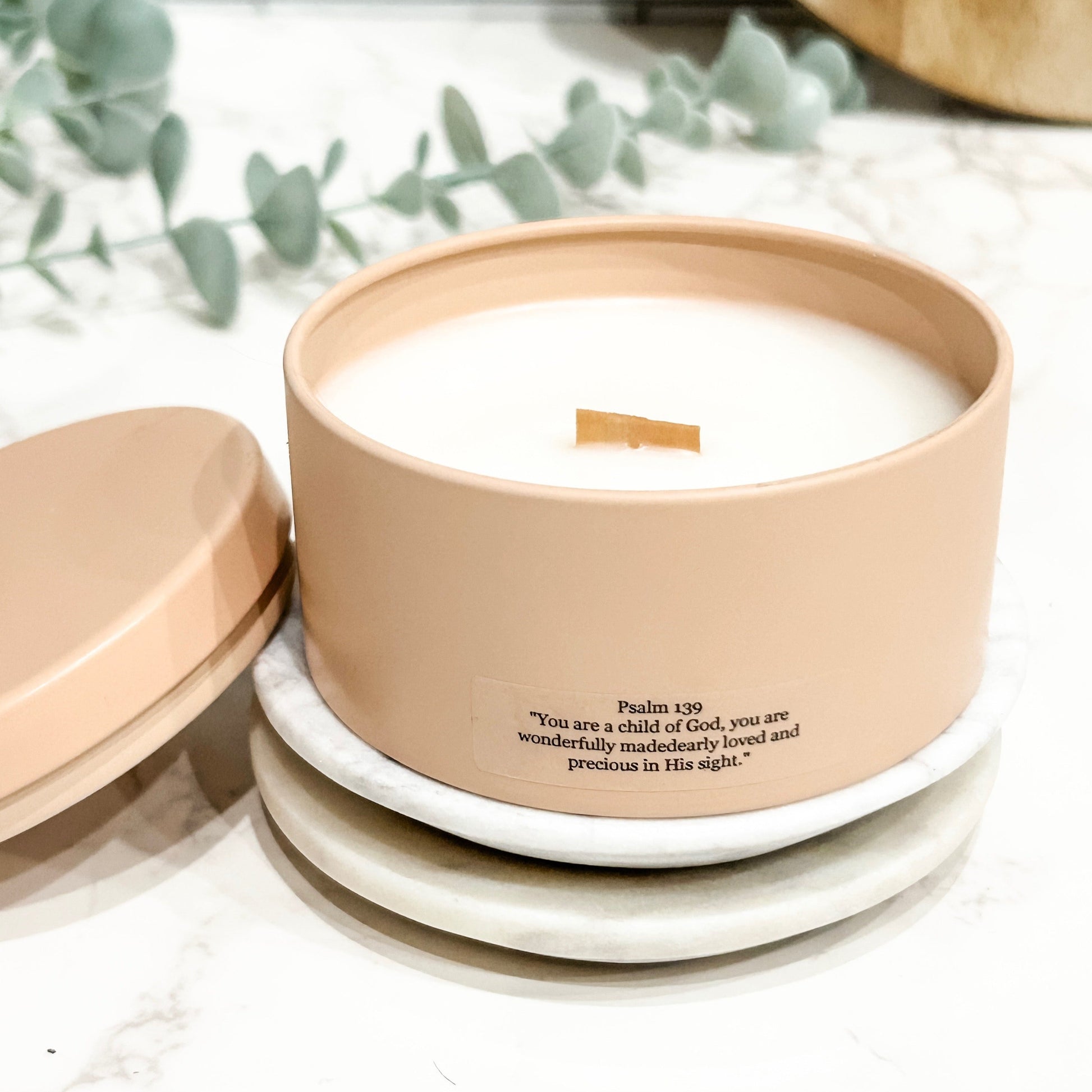 Made of vegan, Coconut Soy Wax, and hand-poured in these gorgeous reusable, metal tins. The addition of eco-friendly pearlized mica makes for a stunning shimmer as it burns. The crackling wooden wick provides just the right amount of crackling for the perfect cozy ambiance.