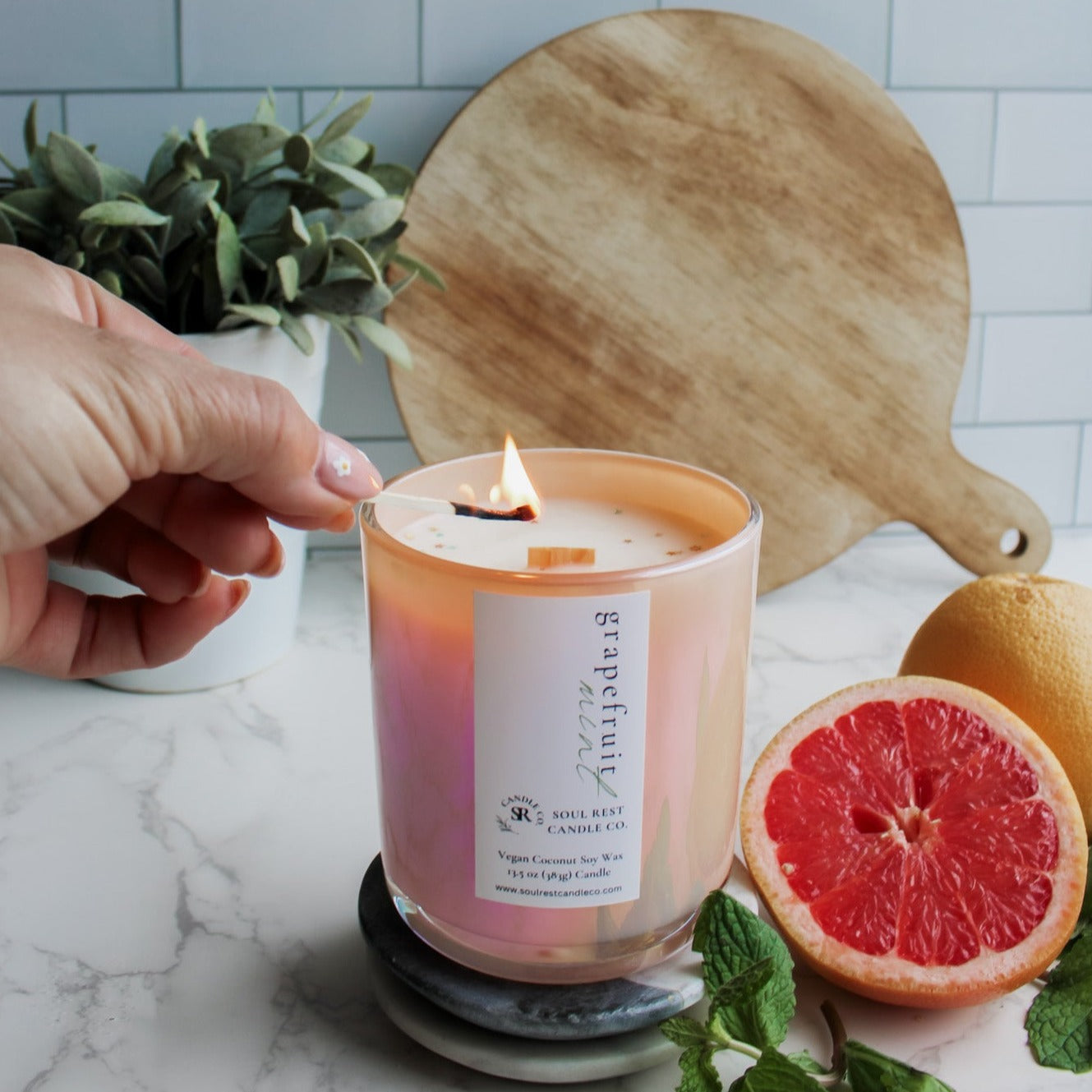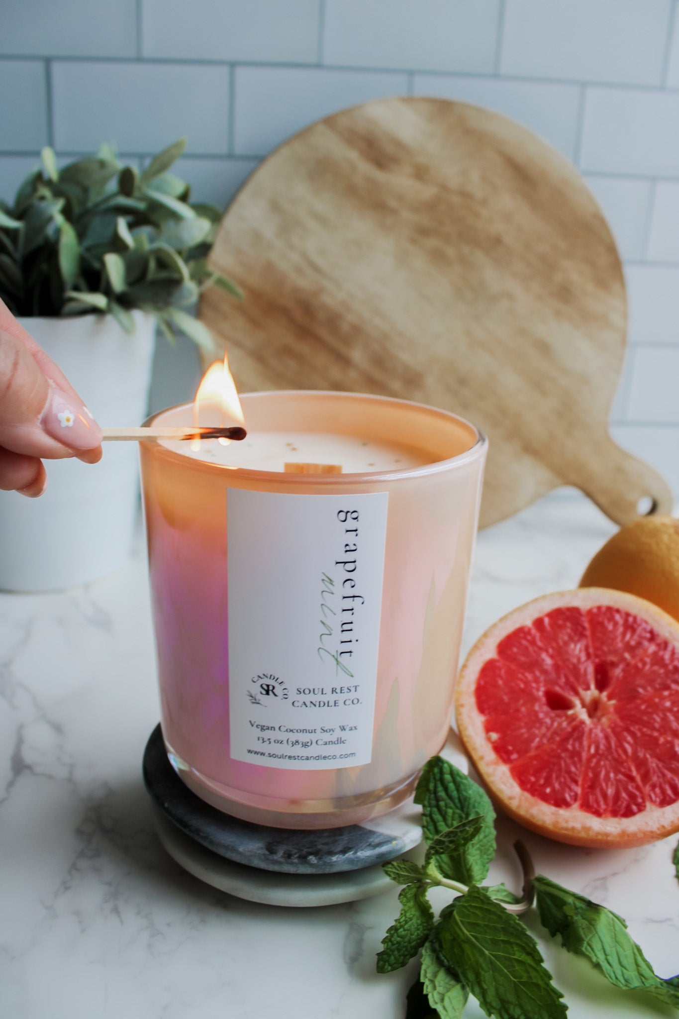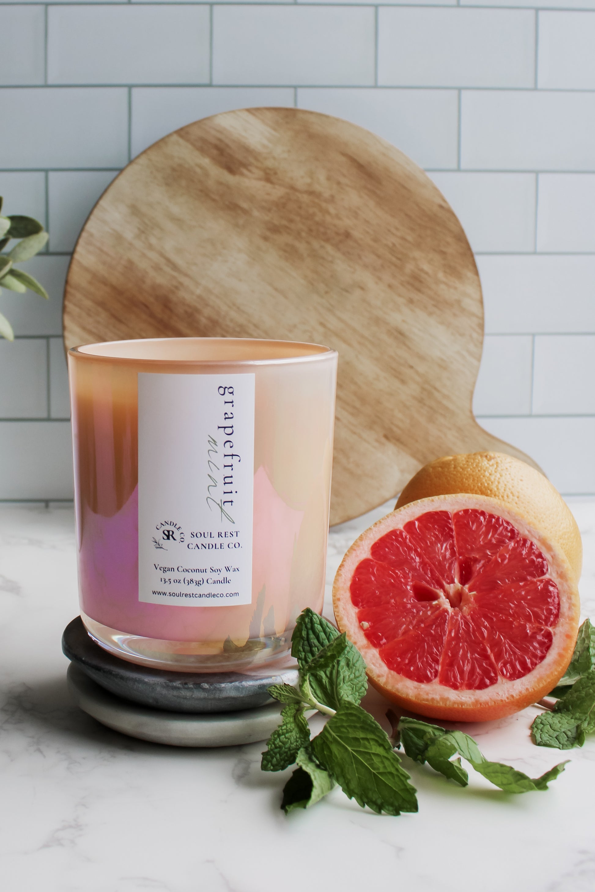 super refreshing and sophisticated, this candle starts with ripe, tangy grapefruit fused with garden-fresh mint. Hints of lavender and rhubarb add depth and complexity to this fresh fragrance. Truly a burst of citrus and mint that you will absolutely love.