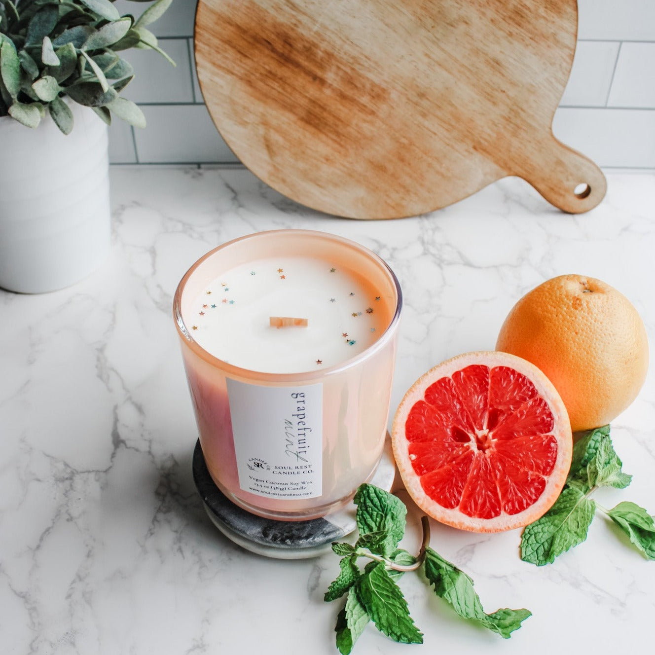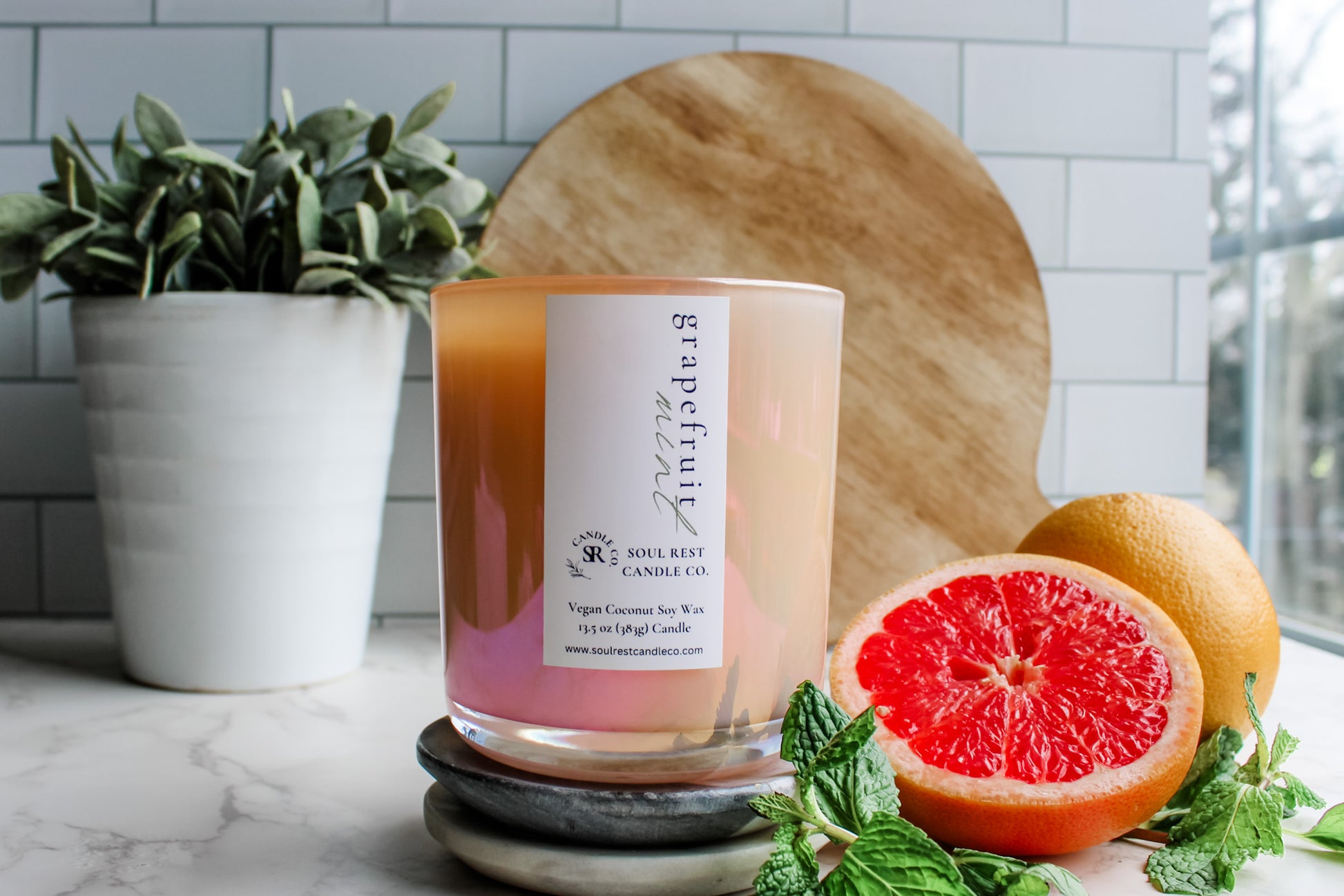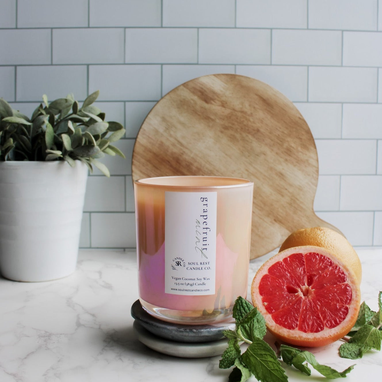 super refreshing and sophisticated, this candle starts with ripe, tangy grapefruit fused with garden-fresh mint. Hints of lavender and rhubarb add depth and complexity to this fresh fragrance. Truly a burst of citrus and mint that you will absolutely love.