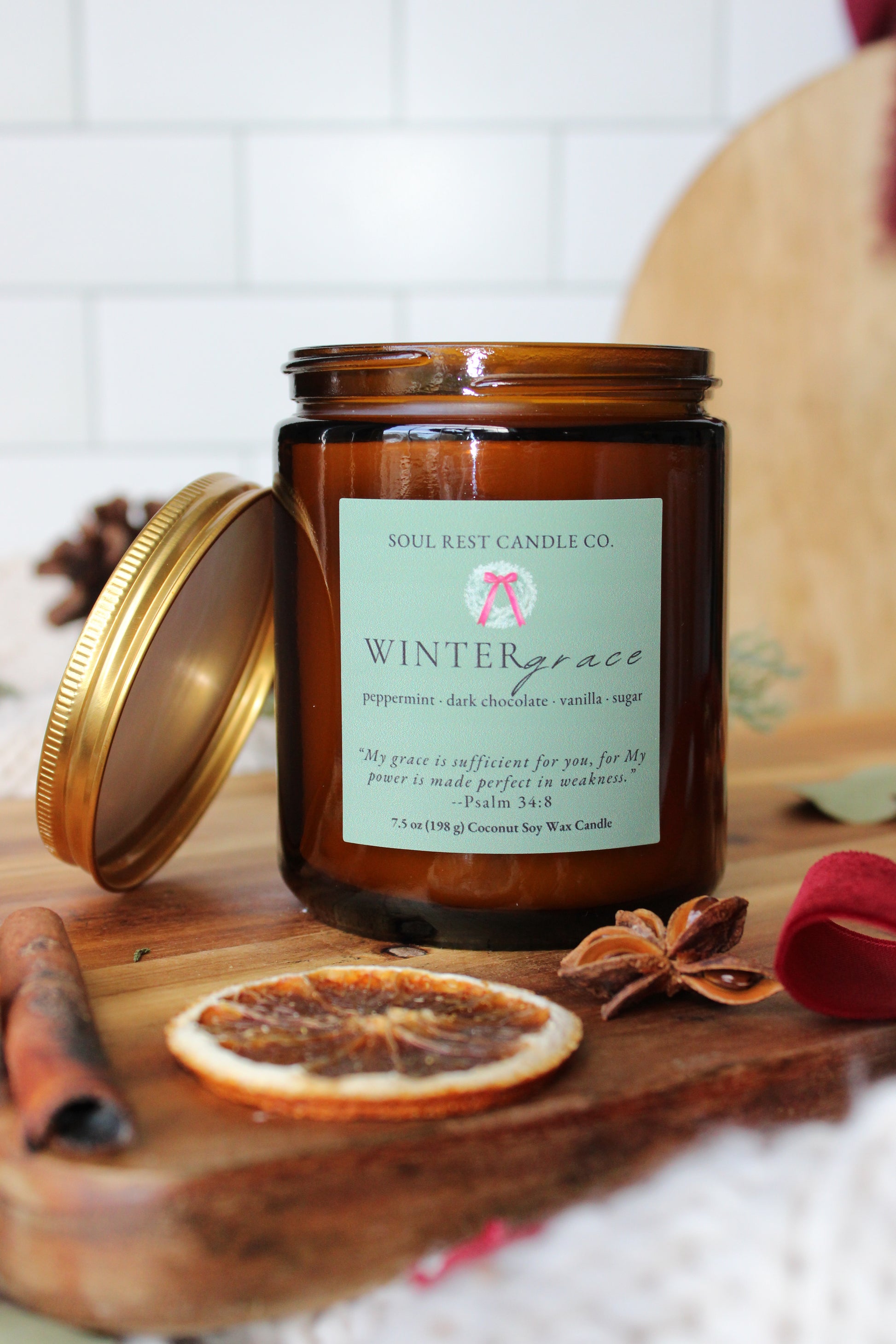 Breathe in the peaceful sweetness of Winter Grace, a refreshing blend of cool peppermint, creamy vanilla, rich chocolate, and warm coconut milk. This candle captures the comforting joy of peppermint bark — crisp, cozy, and irresistible.