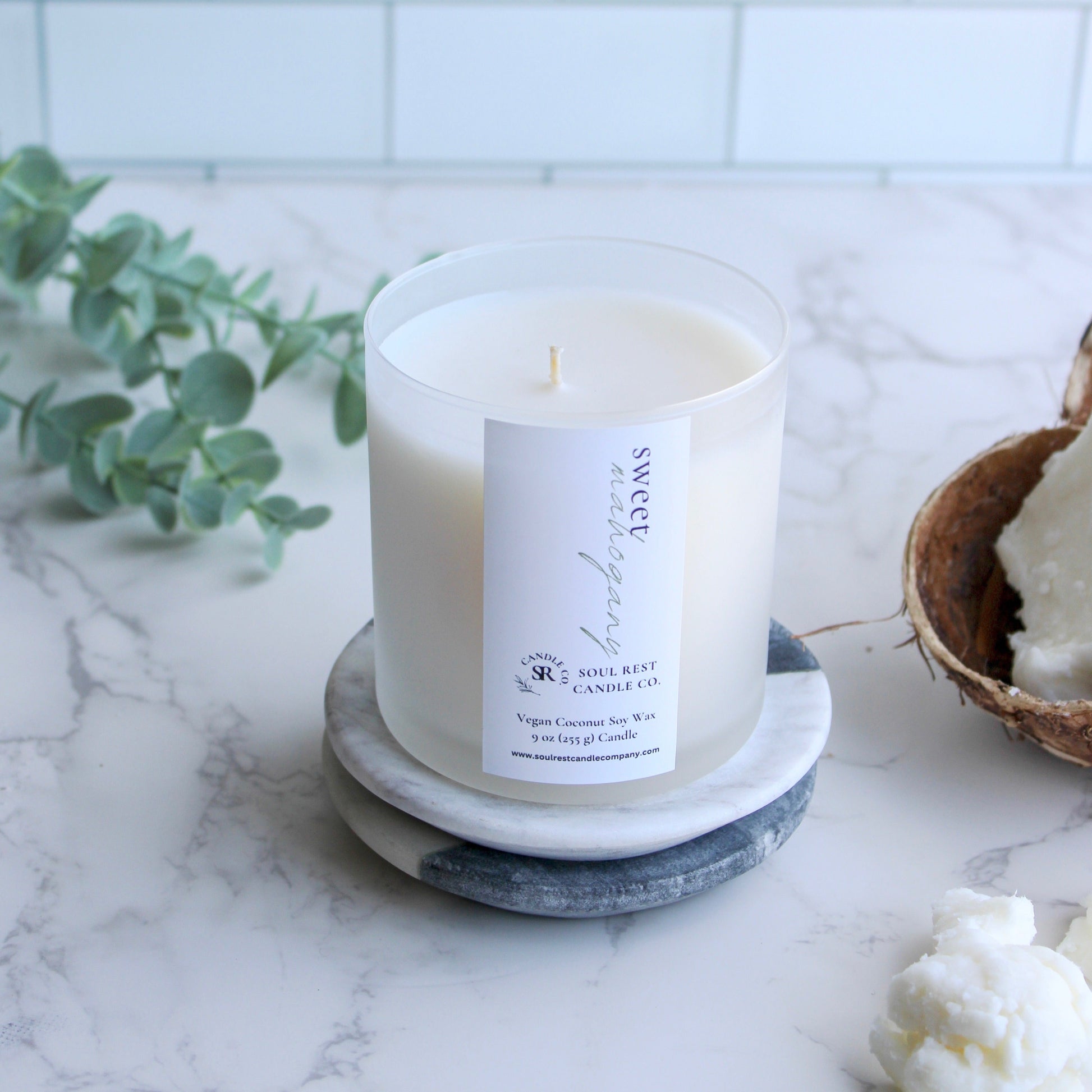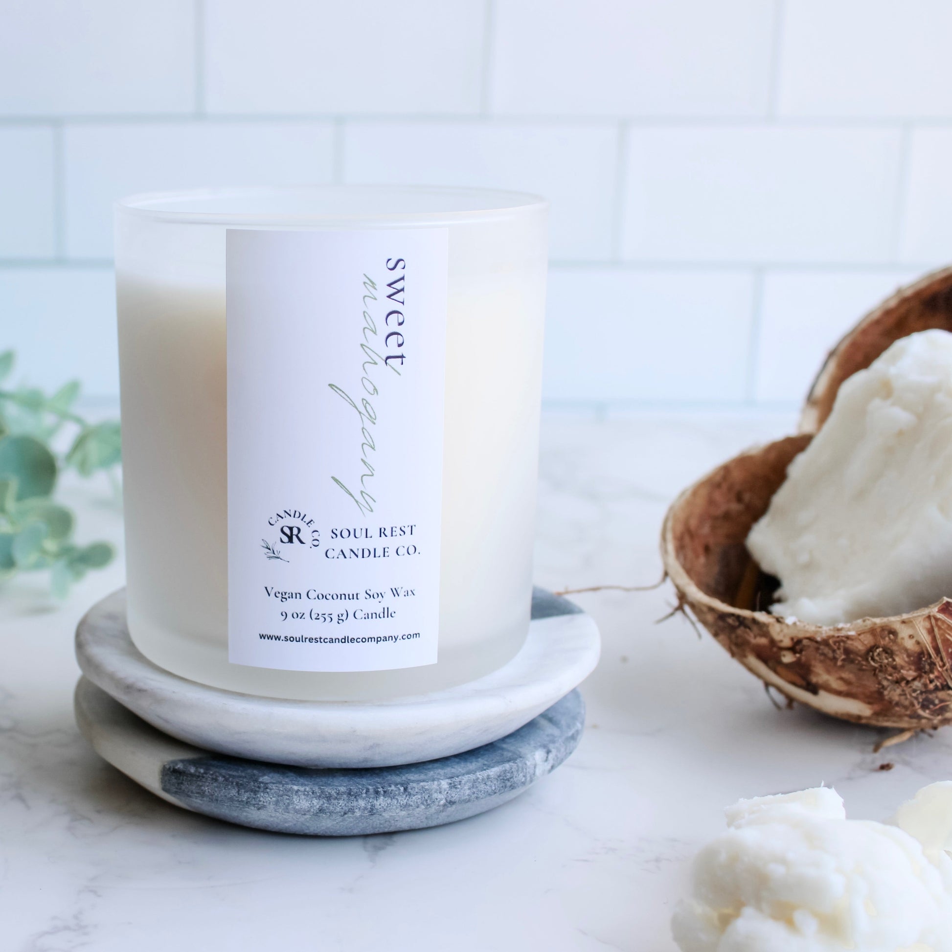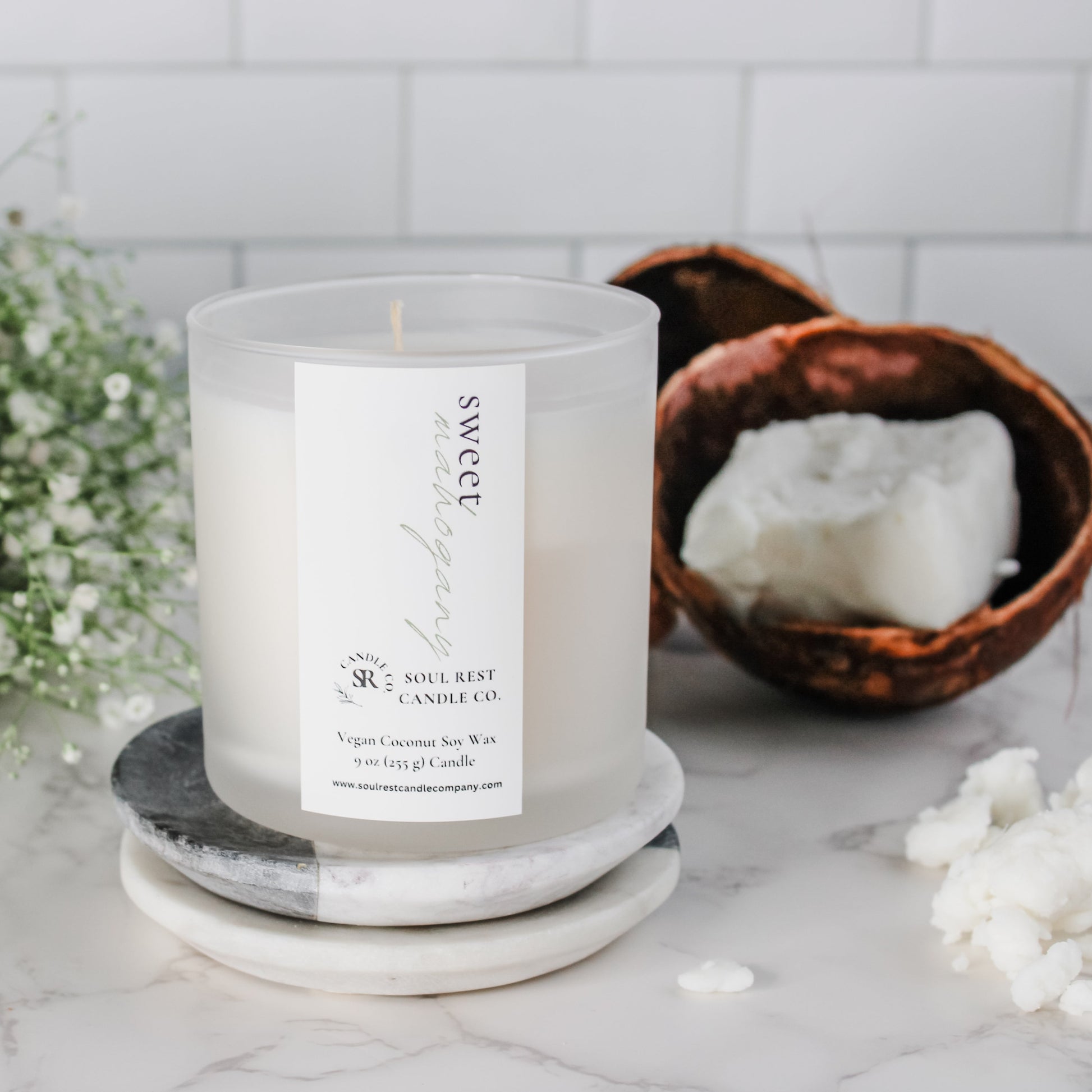 Hand-poured in these gorgeous frost tumblers that can be repurposed as a drinking glass or to store makeup brushes. The addition of eco-friendly pearlized mica makes for a stunning shimmer as it burns.