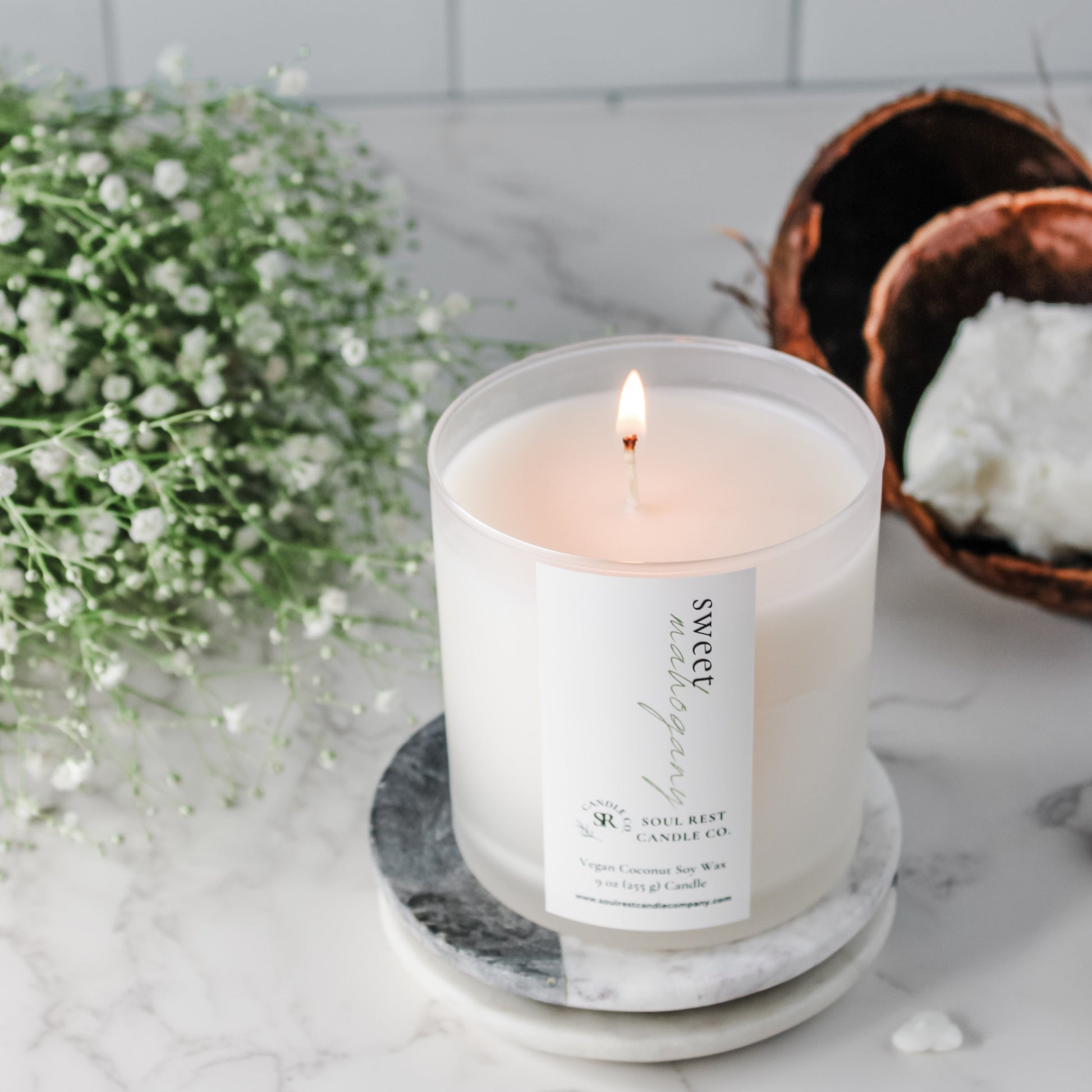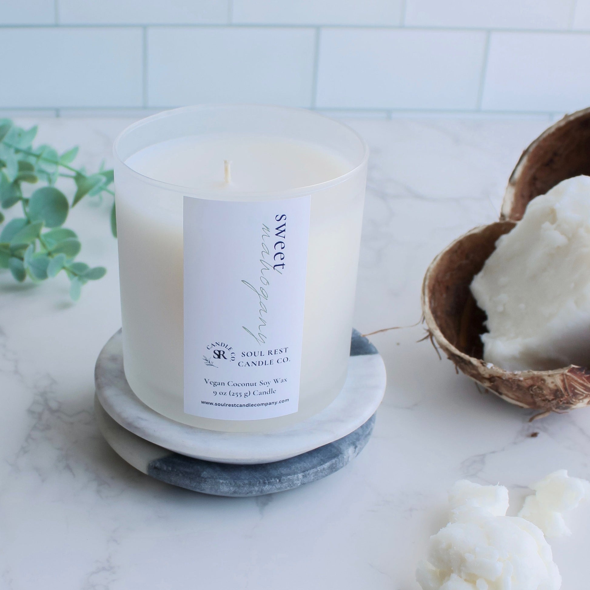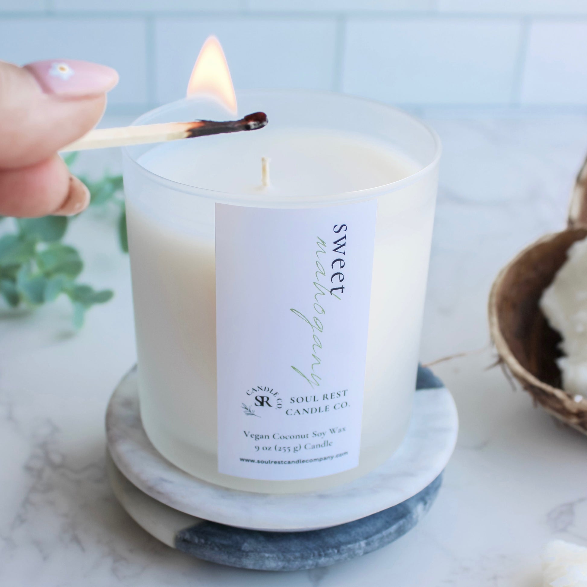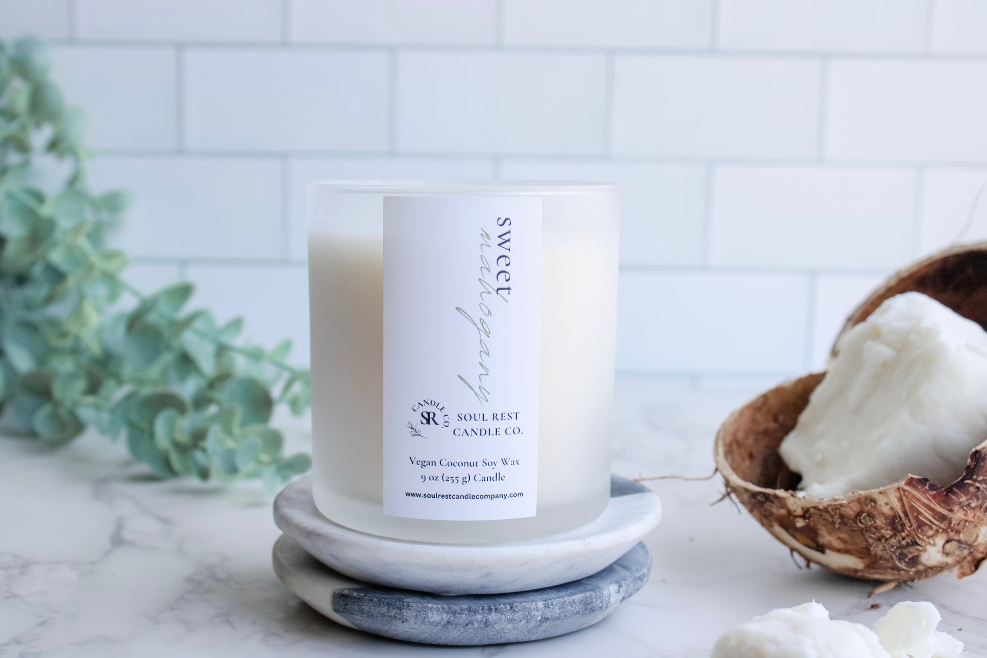 Hand-poured in these gorgeous frost tumblers that can be repurposed as a drinking glass or to store makeup brushes. The addition of eco-friendly pearlized mica makes for a stunning shimmer as it burns.