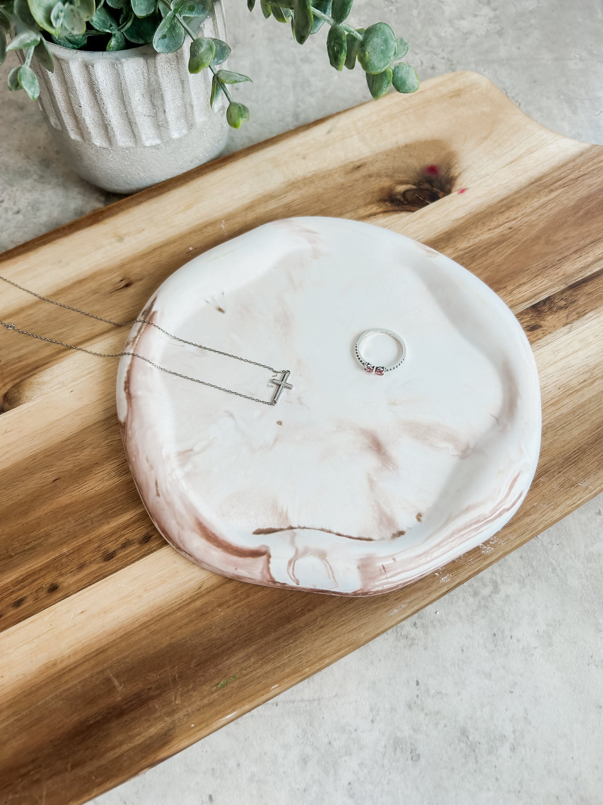 Our Trinket Dishes are handmade from an ecofriendly blend of resin and concrete and sealed with a water and heat resistant sealer but all spills should be wiped away immediately to avoid damage.