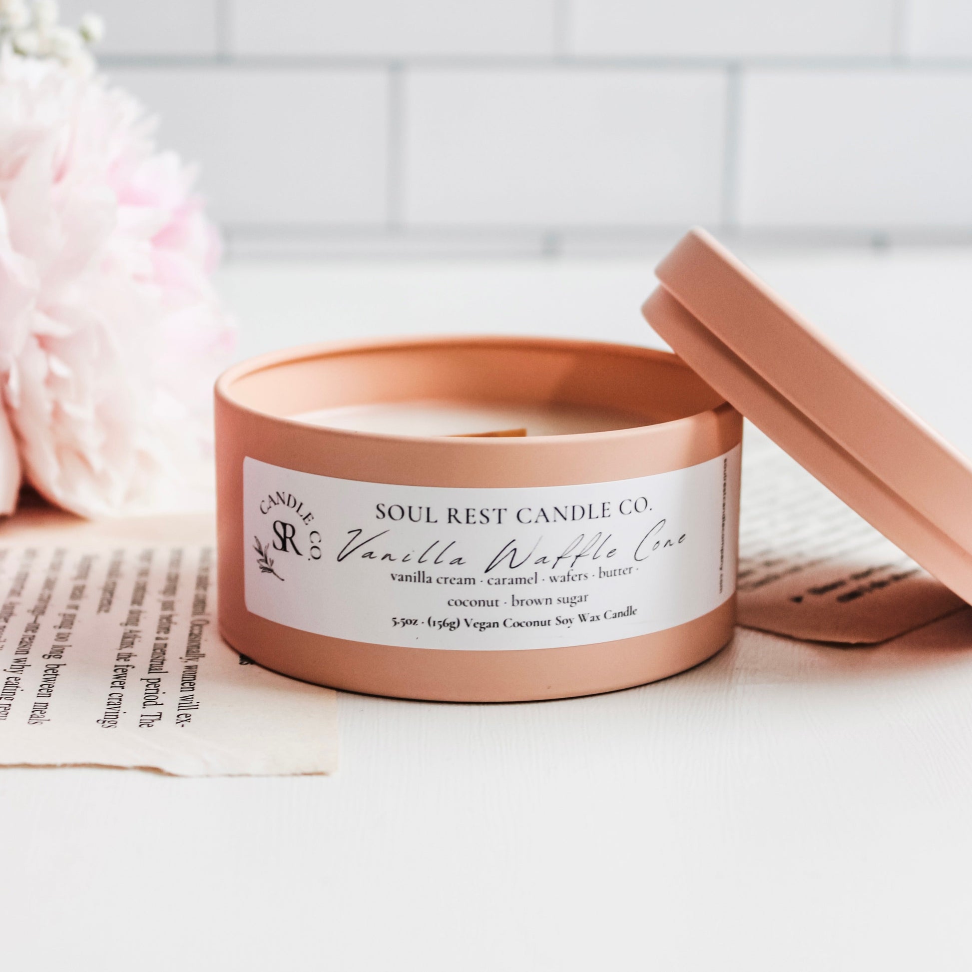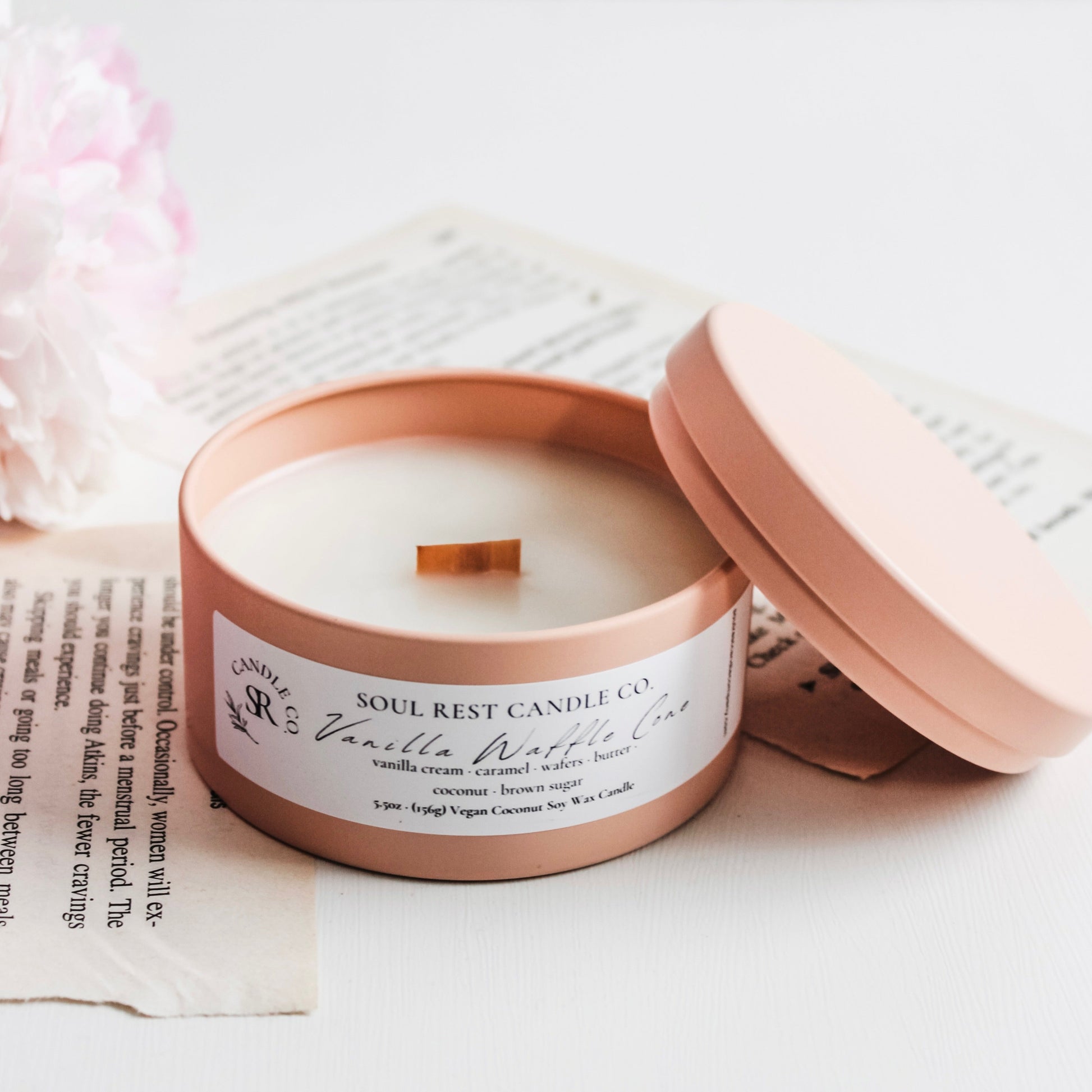 Made of vegan, Coconut Soy Wax, and hand-poured in these gorgeous reusable, metal tins. The addition of eco-friendly pearlized mica makes for a stunning shimmer as it burns. The crackling wooden wick provides just the right amount of crackling for the perfect cozy ambiance.